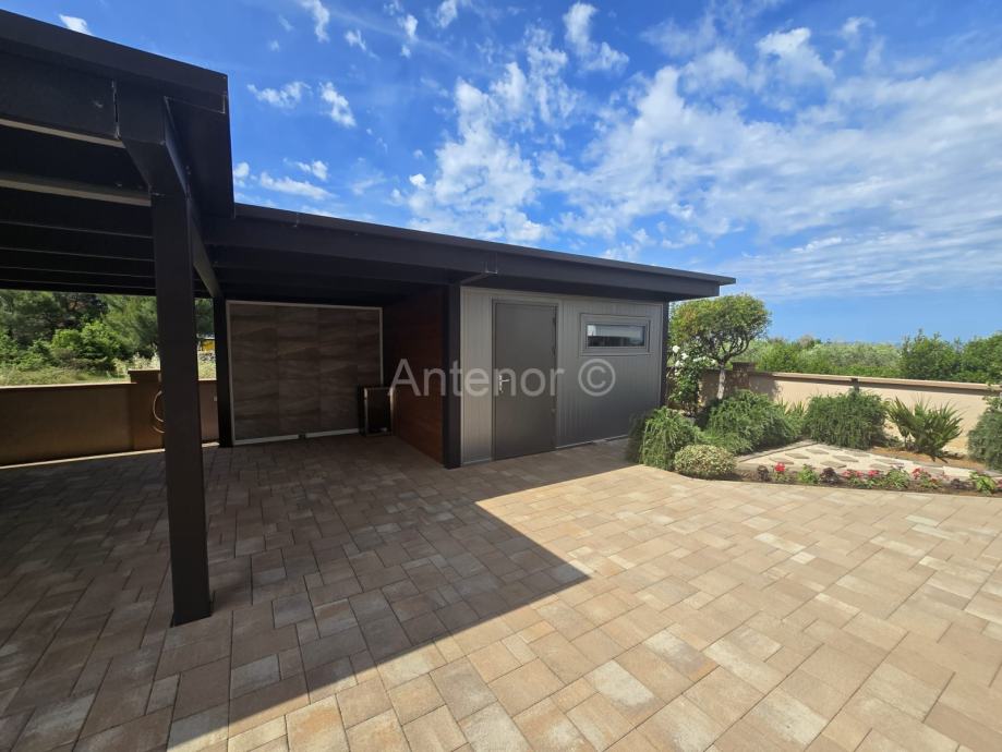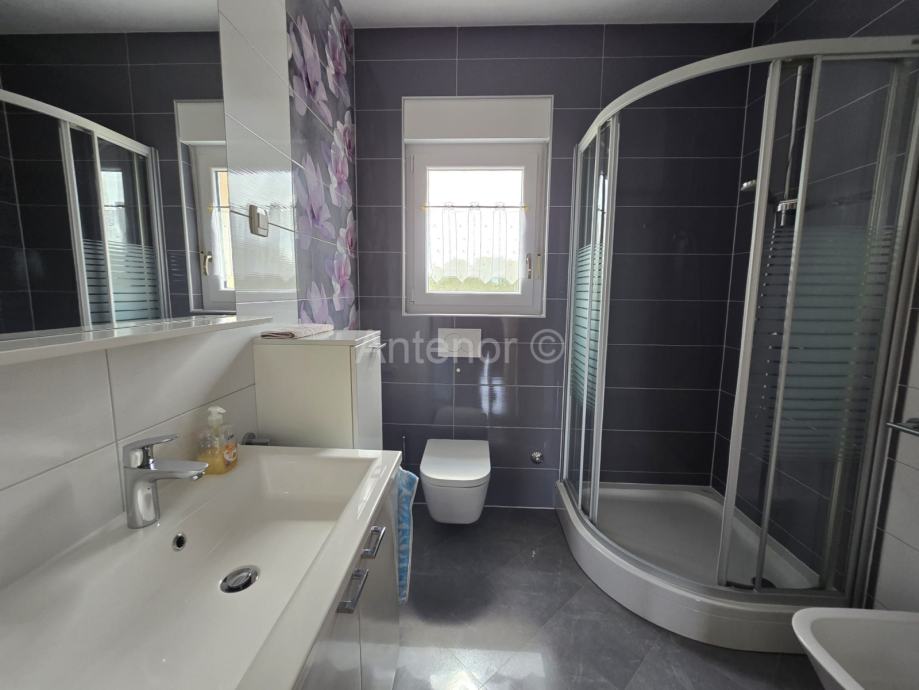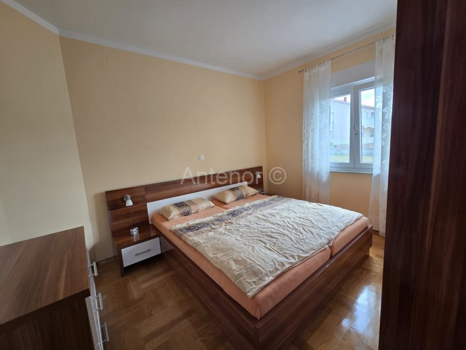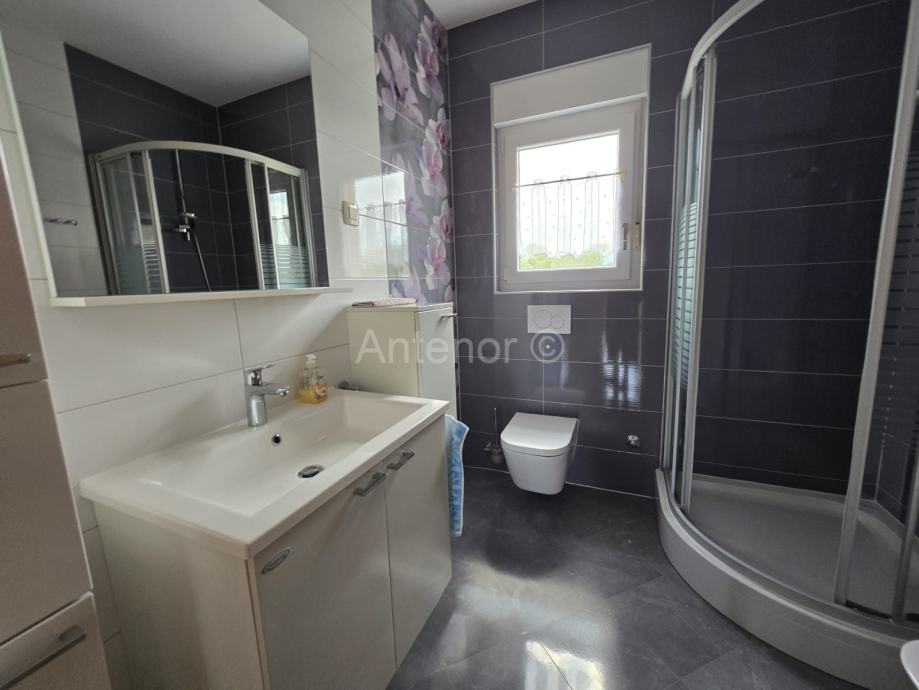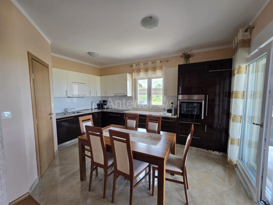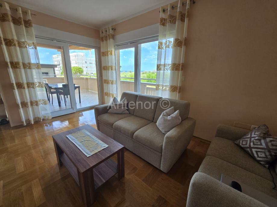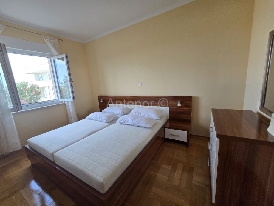 NIN-ZATON - prodaje se apartaman koji se sastoji od spremišta, kupaonice, dvije spavaće sobe, kuhinje, blagavaonice, dnevnog boravka, lođe i natkrivene terase ukupne korisne površine 92,10 m2. Apartmanu pripada i vrt korisne površine 44,60 m2. Apartman se nalazi u manjoj stambenoj zgradi od ukupno 4 stambene jedinice, a udaljenost od mora i plaže je 200 m. Vlasništvo uredno bez tereta.