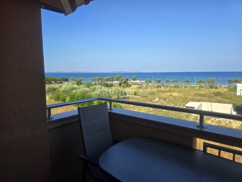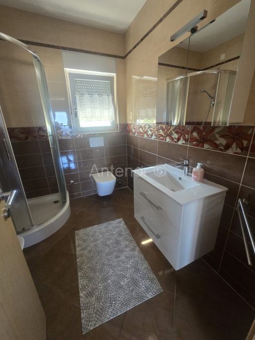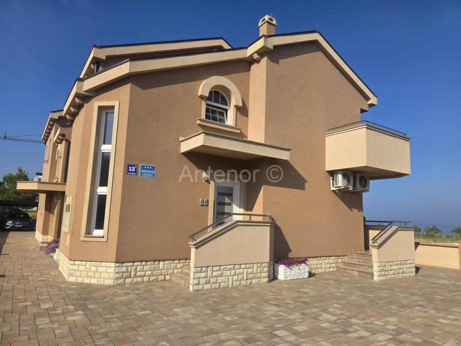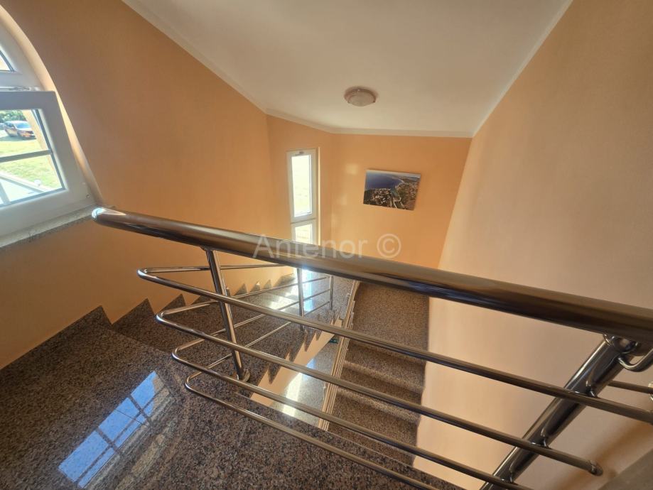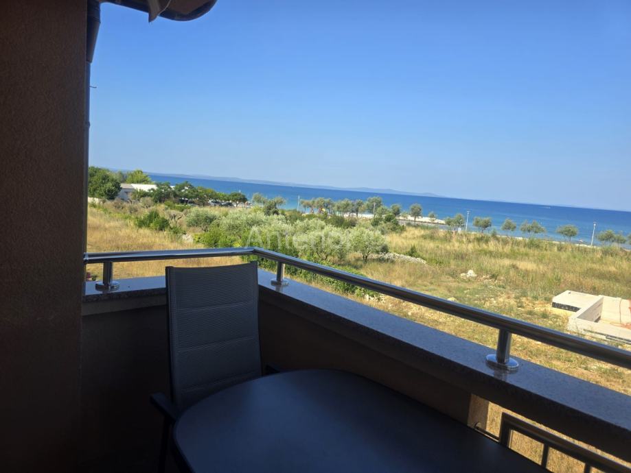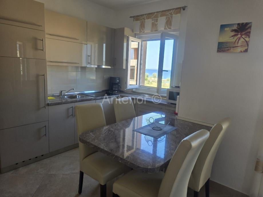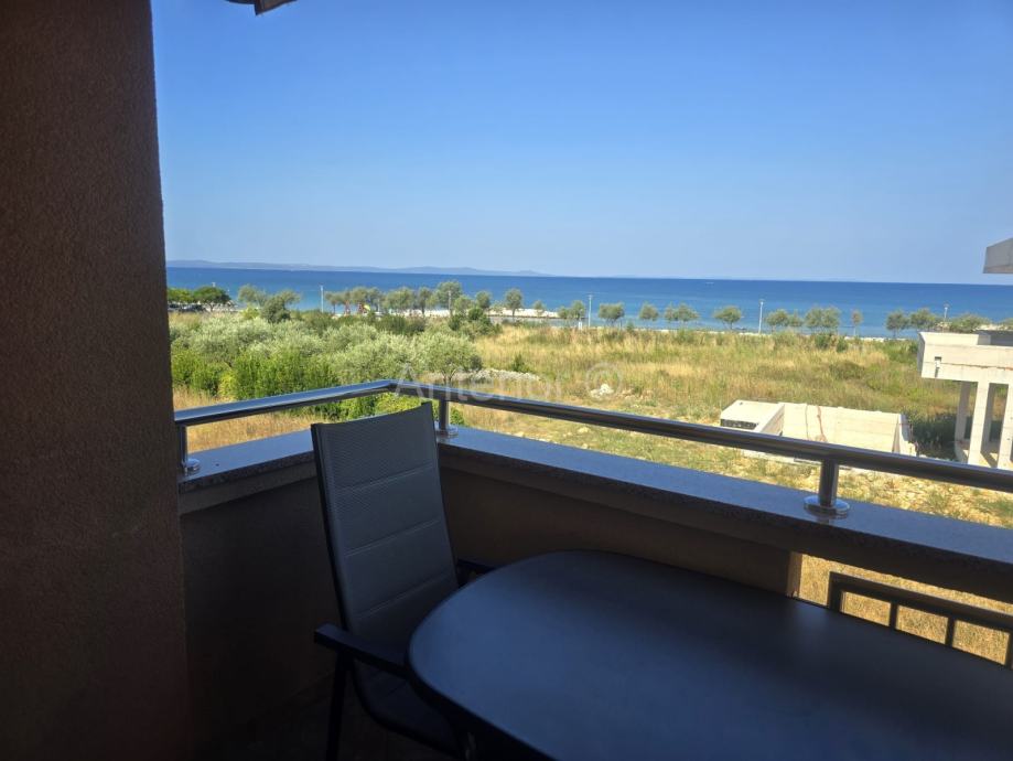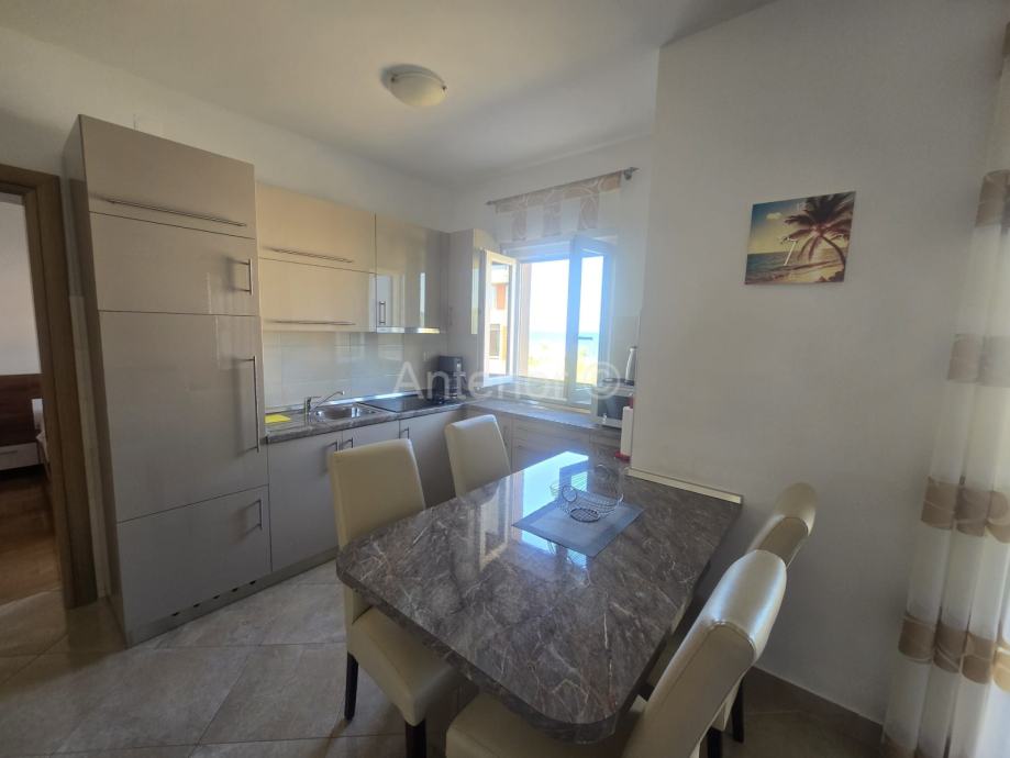 Apartman se nalazi na u prizemlju zgrade tlocrtne površine 57,90 m2. Sastoji se od kuhinje, blagavaone, dnevnog boravka, lođe, terase, kupaonice i dvije spavaće sobe. Iz kuhinje, spavaće sobe i terase se pruža otvoren pogled na more. Apartmanu pripadaju dva parkirna mjesta površine 26 m2, dvorište i vrt s vanjskim roštiljem površine 39,80 m2. Sveukupna brutto površina apartmana sa pripadcima iznosi 123,70 m2 ( netto površina 71,94 m2). Cijena: 268.000,00 eura.