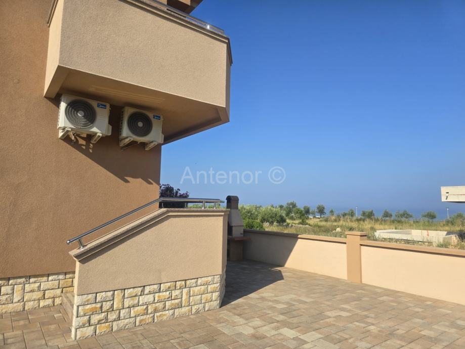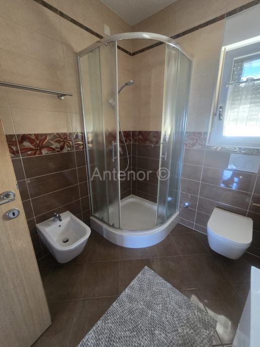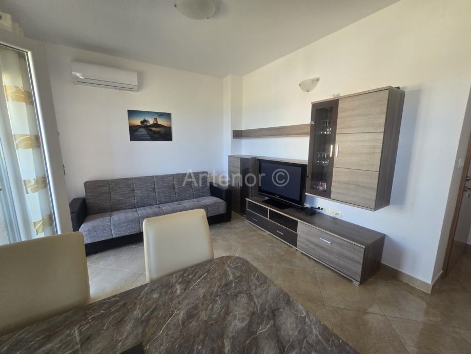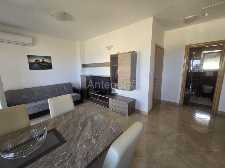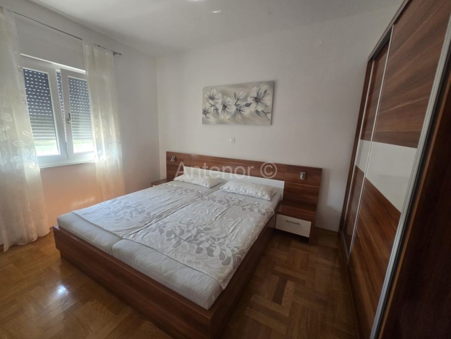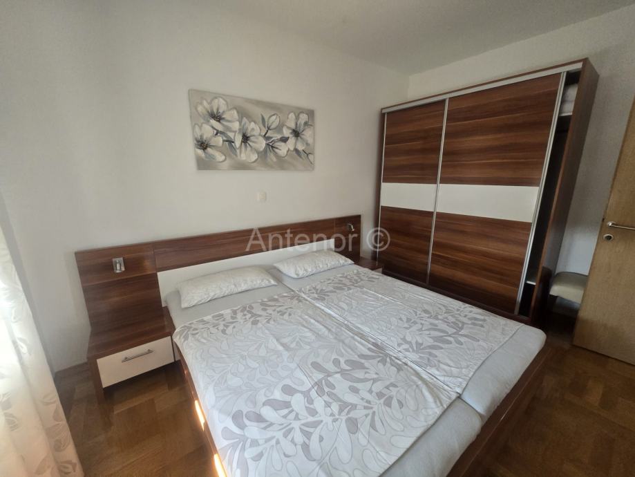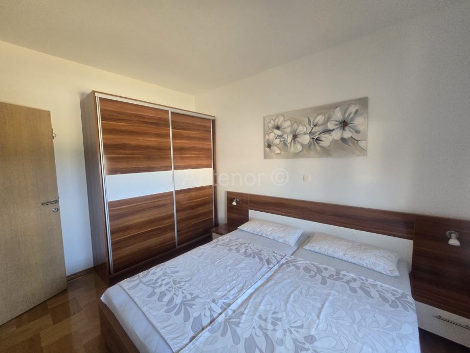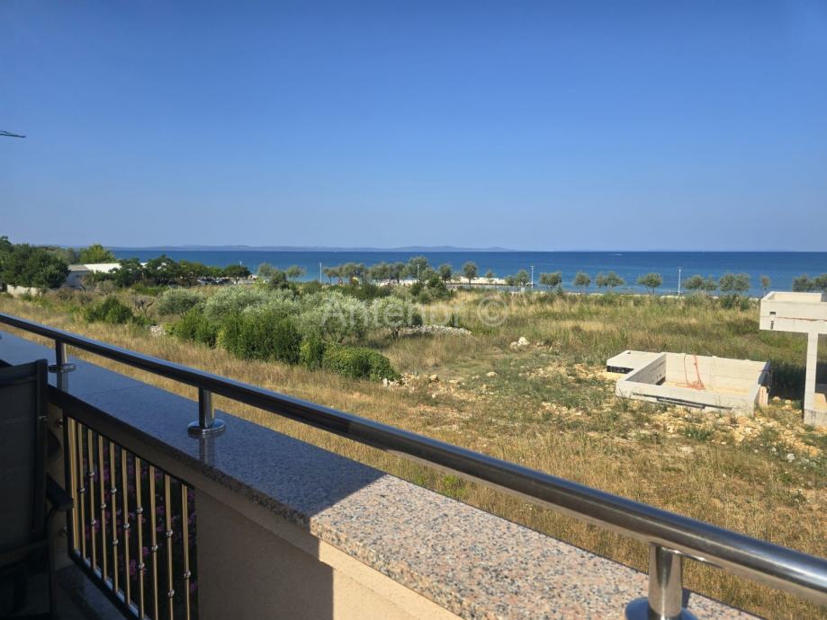 Apartman se nalazi na u prizemlju zgrade tlocrtne površine 57,90 m2. Sastoji se od kuhinje, blagavaone, dnevnog boravka, lođe, terase, kupaonice i dvije spavaće sobe. Iz kuhinje, spavaće sobe i terase se pruža otvoren pogled na more. Apartmanu pripadaju dva parkirna mjesta površine 26 m2, dvorište i vrt s vanjskim roštiljem površine 39,80 m2. Sveukupna brutto površina apartmana sa pripadcima iznosi 123,70 m2 ( netto površina 71,94 m2). Cijena: 268.000,00 eura.