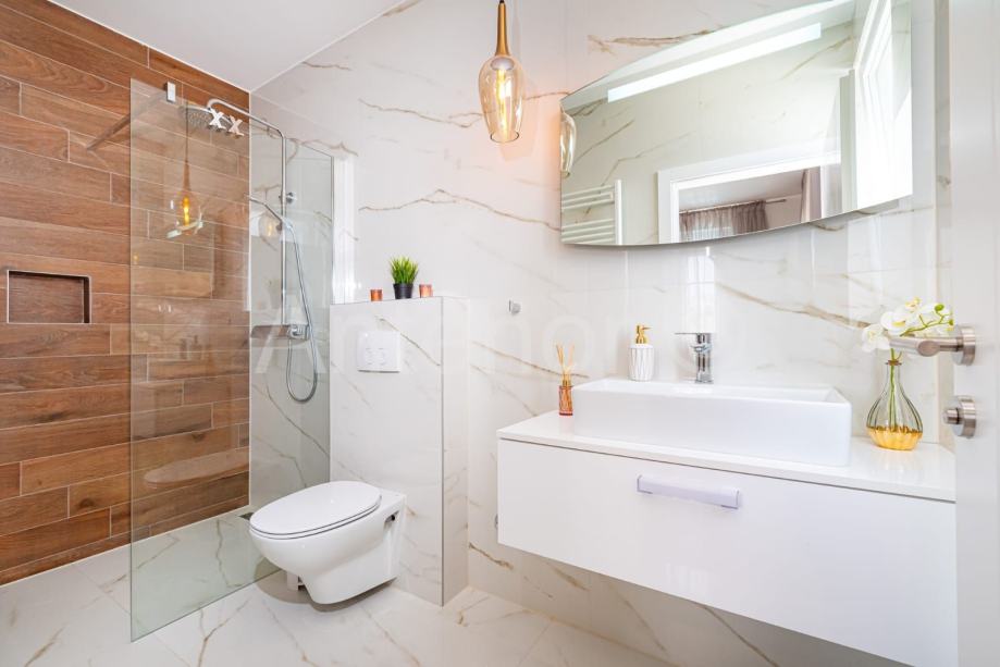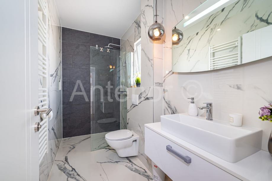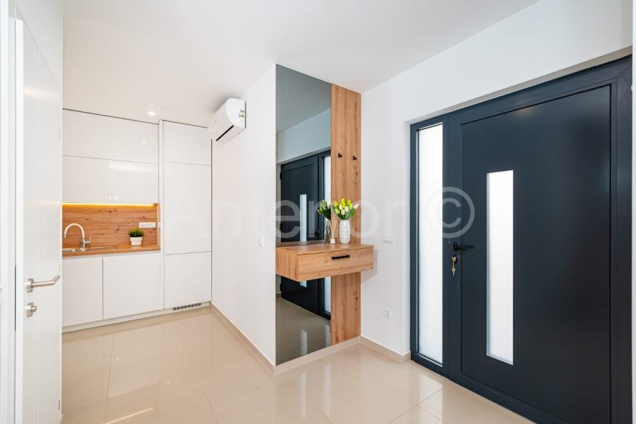 Stan 2 se sastoji od ulaznog prostora, dnevnog boravka, kuhinje, blagavaone, wca i spremišta u prizemlju. Stubištem se dolazi na 1. kat gdje se nalazi hodnik, spavaća soba, garderoba i kupaonica.