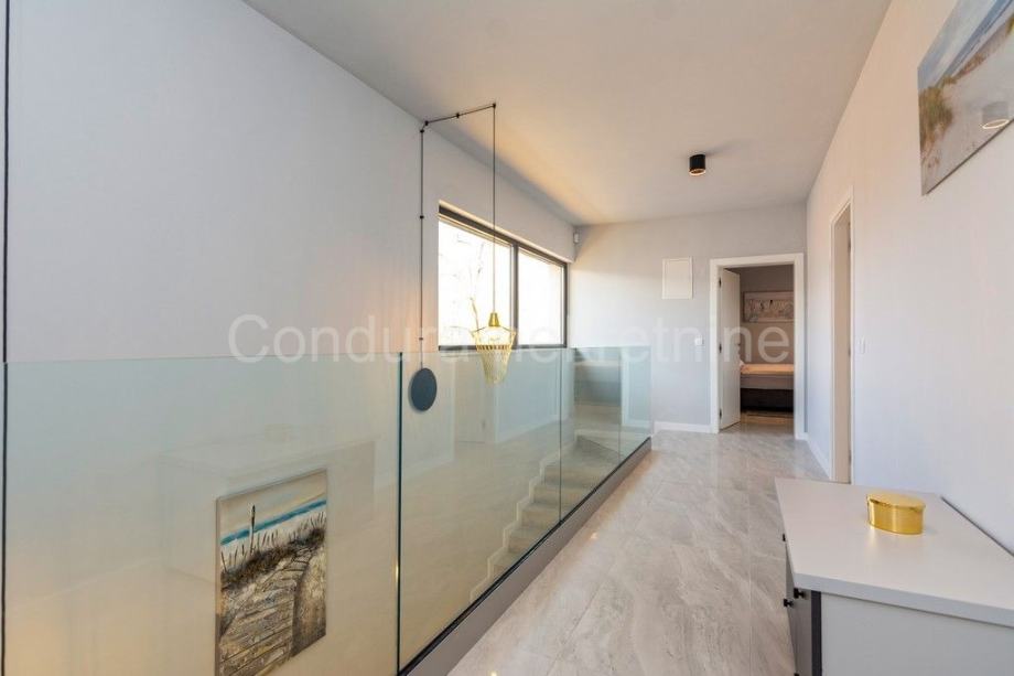 Kuća je sagrađena na zemljištu veličine 542 m2 te ima neto korisnu površinu 173,35 m2. Prizemlje se sastoji od ulaznog prostora, jedne spavaće sobe, kupaonice i prostranog "open space" koncepta kuhinje s blagovaonicom i dnevnim boravkom. Pogled iz kuće se kroz velike staklene stijene pruža na skladno uređeno dvorište s grijanim bazenom (32 m2), sunčalištem i ljetnom kuhinjom. Na gornjem katu se nalazi hodnik i tri spavaće sobe svaka s vlastitom kupaonicom, a dvije sobe imaju i izlaz na vlastitu lođu s prekrasnim pogledom na okolicu.