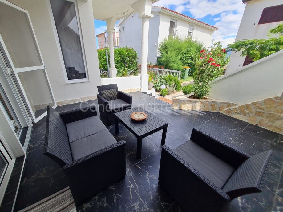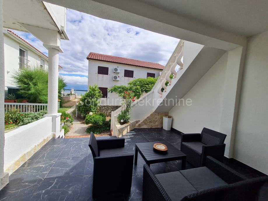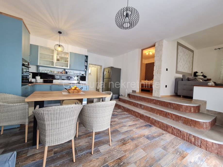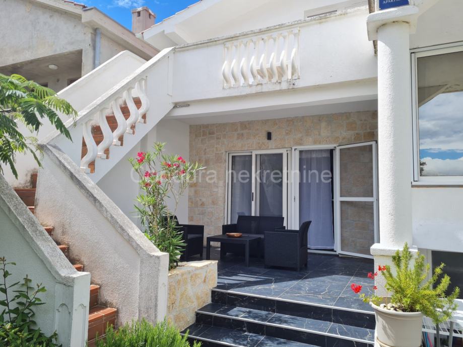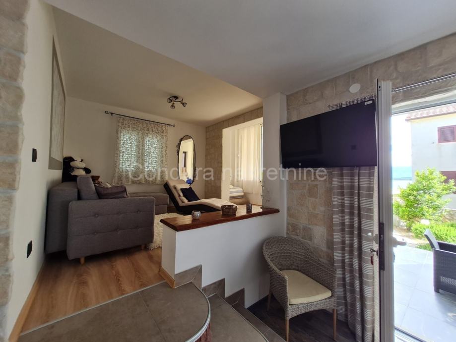 Prodaje se apartman u prizemlju kuće sa tri stambene jedinice. Apartman neto površine 59,14 m2 se sastoji od kuhinje s blagovaonicom, dnevnog boravka, jedne spavaće sobe, kupaonice i djelomično natkrivene terase s prekrasnim pogledom na more.