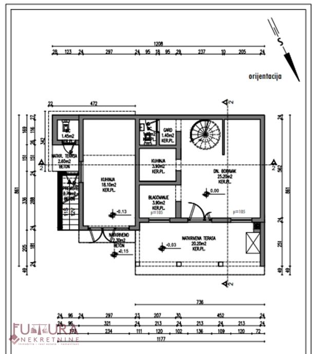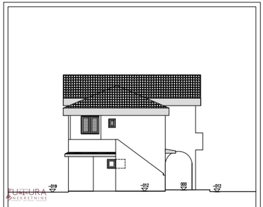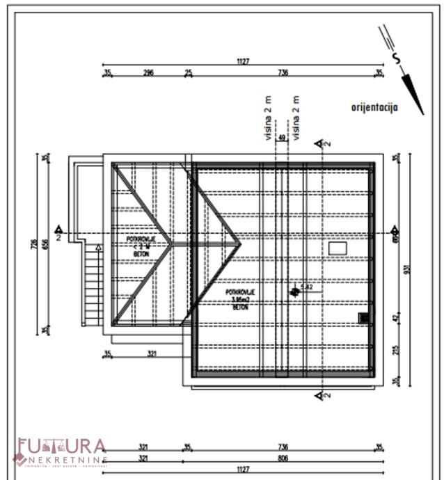 Prizemlje: dnevni boravak, kuhinja + blagovaona, kupaonica, ostava i natkrivena terasa.