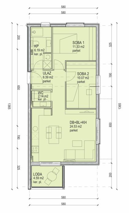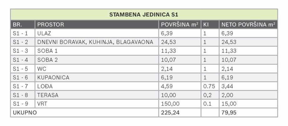Okvirni izračun za stan S1 s vrtom: NKP 59,51m2 + lođa 4,59m2 + terasa 10,00m2 + vrt 150,00m2