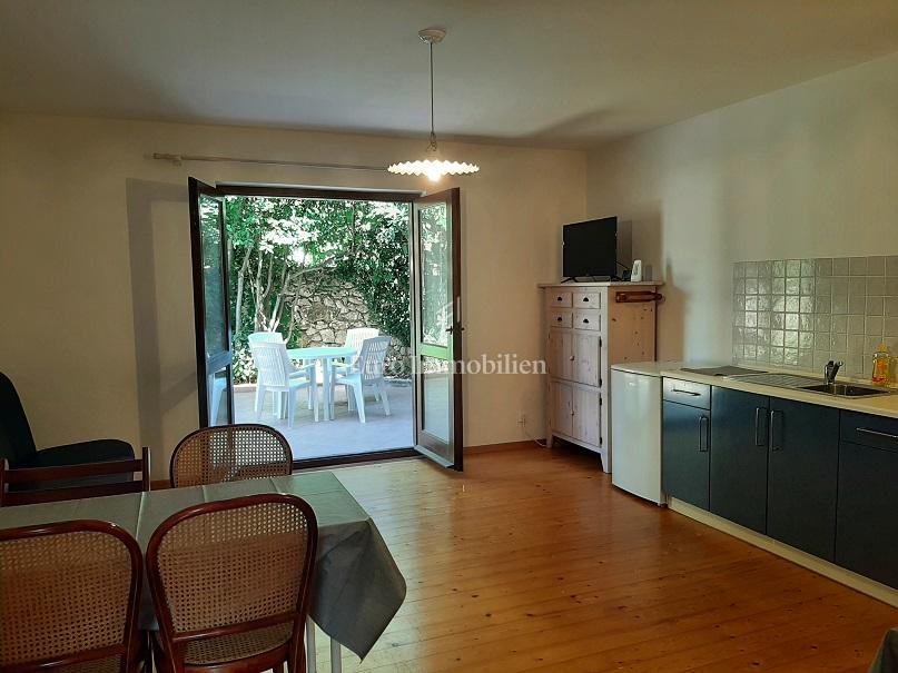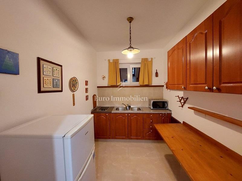 U prizemlju se nalazi prostrana kuhinja s dnevnim boravkom iz kojeg se izlazi na terasu u hladovini. Drvene stepenice vode na kat gdje se nalazi velika spavaća soba i kupaonica.
