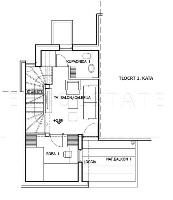 PRVI KAT: stubište, TV salon / galerija, soba 1 / kupaonica 1, loggia, balkon 1