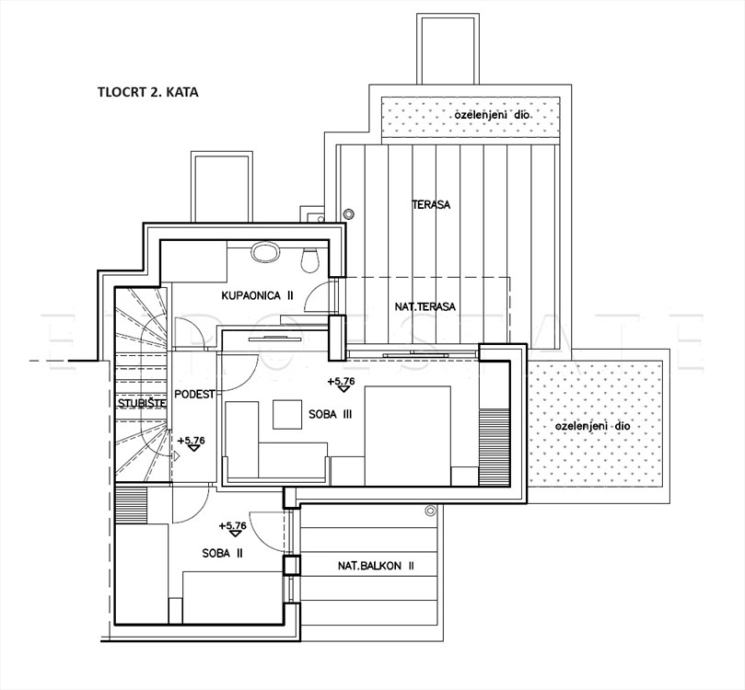 DRUGI KAT: podest, soba 2, soba 3, kupaonica 2, balkon 2