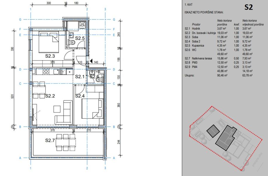 Prodaje se trosobni apartman (S2) obračunske površine cca 63,78 m2 na I katu novogradnje u Novalji.