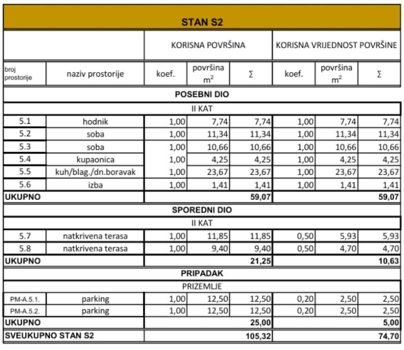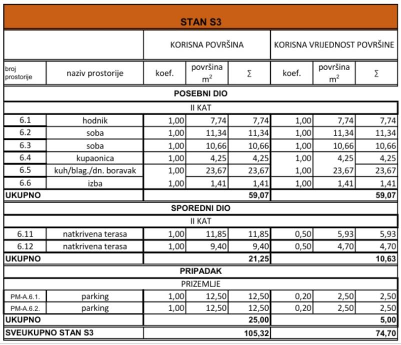 Sastoji se od ulaznog hodnika, 2 sobe, dnevnog boravka s kuhinjom i blagovaonom, kupaone, izbe i 2 natkrivene terase.