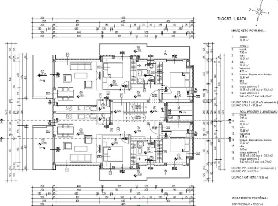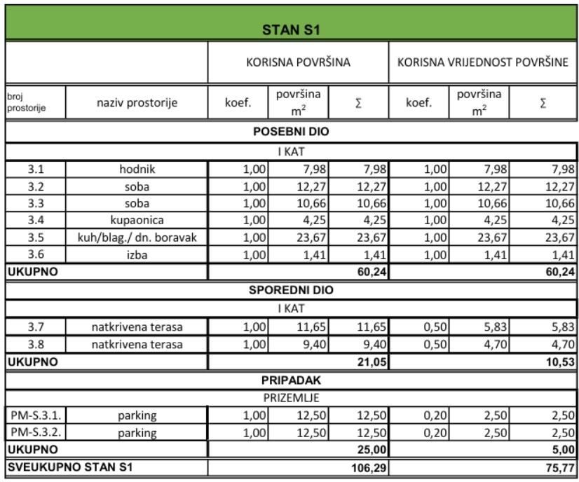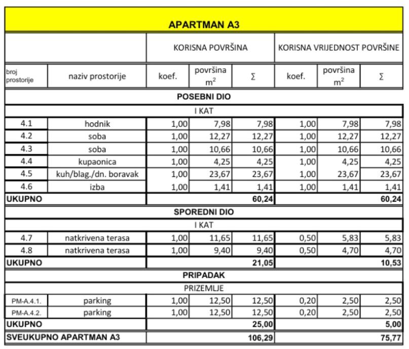 Prodaje se trosobni apartman (S1 i A3) obračunske površine 75,77 m2 na I katu atraktivne novogradnje u Novalji.