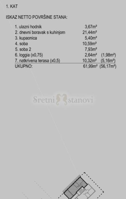 Prodajemo izuzetno kvalitetnu novogradnju, na traženoj i lijepoj lokaciji s pogledom na more. Zgrada sa četiri stana, parkirnim mjestima i zelenim vrtom. Stan na prvom katu, ima dvije spavaće sobe, dnevni boravak sa kuhinjom, kupaonu, hodnik, loggiu, natkrivenu terasu s lijepim pogledom. Stan dodatno ima dva parkirna mjesta sa priključkom za punjenje elektro ili hibridnih vozila u ograđenoj okućnici zgrade. Istaknuta cijena je ukupna cijena sa parkingom. PDV je u cijeni. Grijanje je izvrsno, podno etažno u svim prostorijama, a klimatizacija Samsung grijanje/hlađenje u dnevnom boravku i sobama.