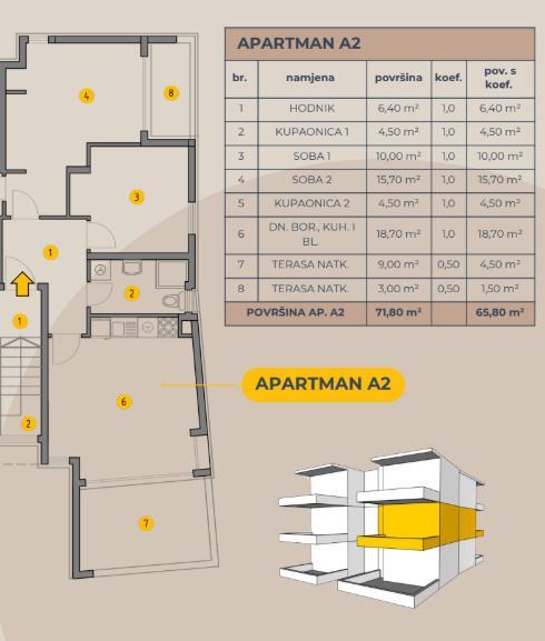 Prodaje se odličan komforan stan na prvom katu ukupne stambene površine 71,80 m2, koji se sastoji od hodnika, dvije spavaće sobe, dvije kupaonice, kuhinje s blagovaonicom i dnevnim boravkom, te dvije natkrivene terase. Šifra objekta: A_A2.