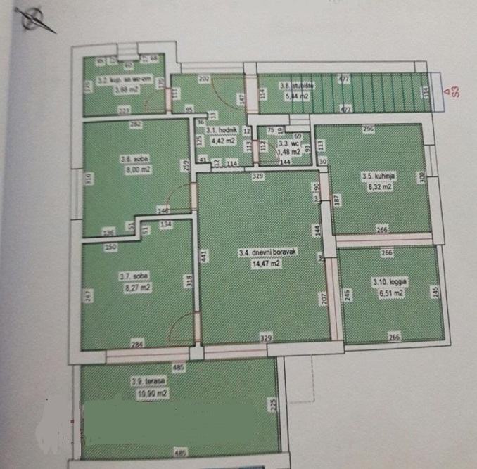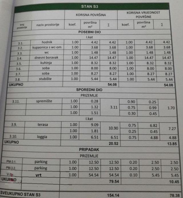 I KAT: hodnika, kupaonice s wc-om, wc-a, dnevnog boravka, kuhinje, tri sobe i stubišta, kojim se pristupa stanu iz prizemlja, sve zajedno ukupne korisne površine 54,08 m2 + terasa korisne površine 10,90 m2 i loggia korisne površine 6,51 m2.