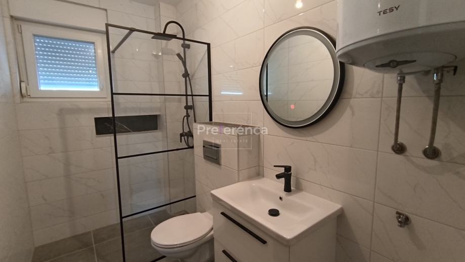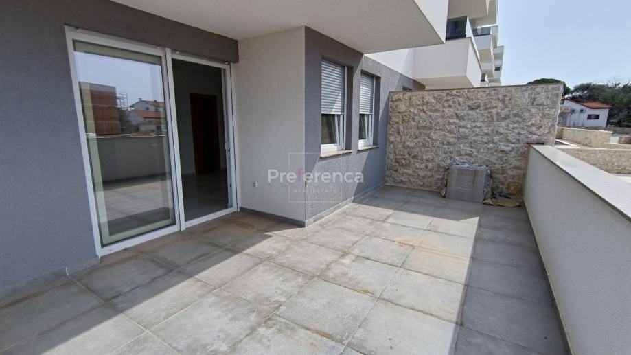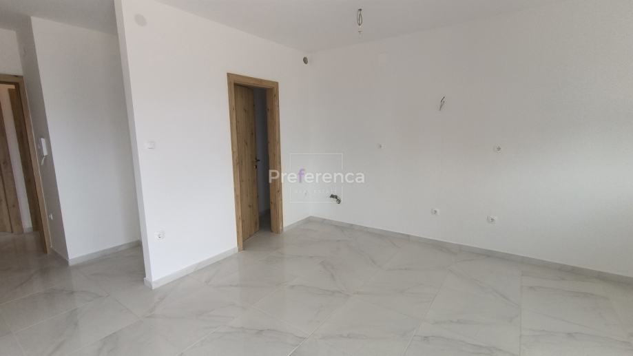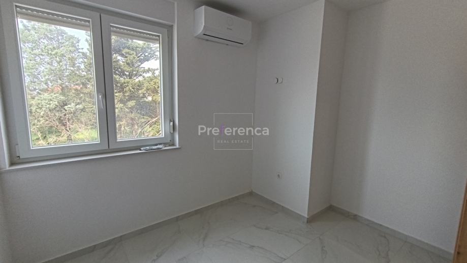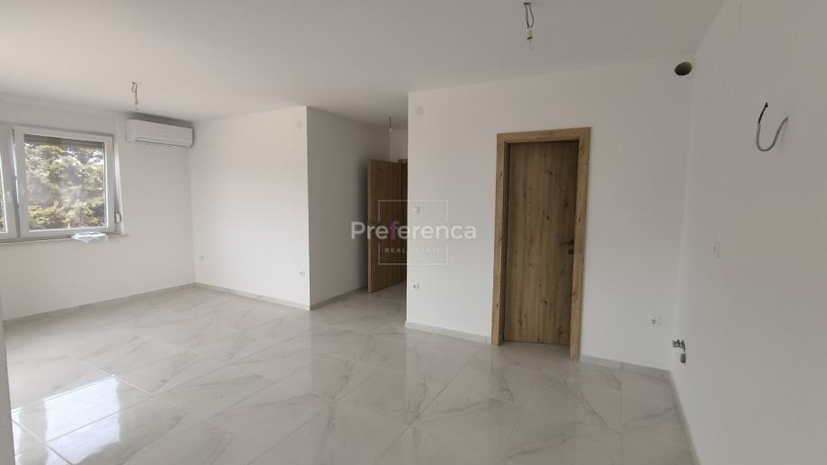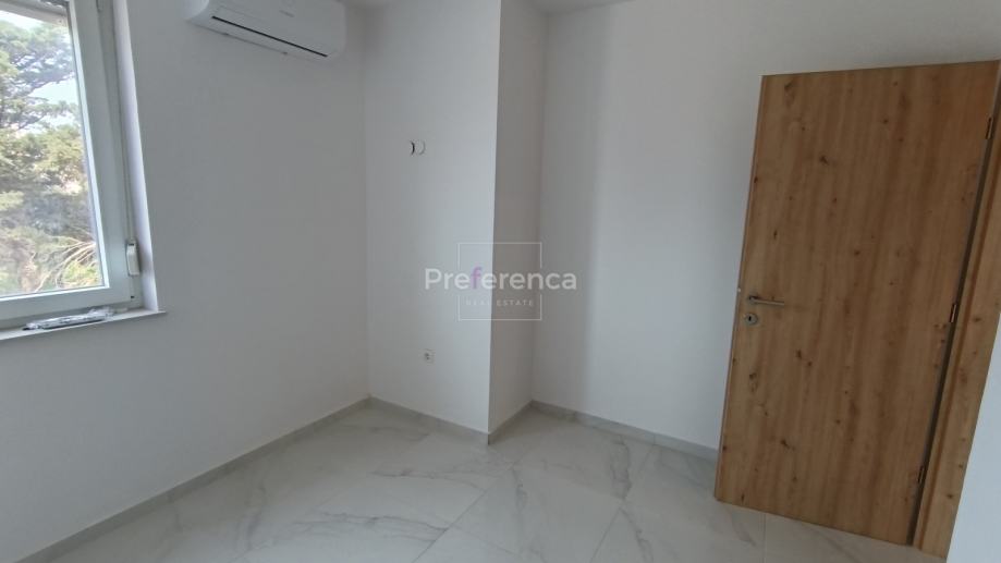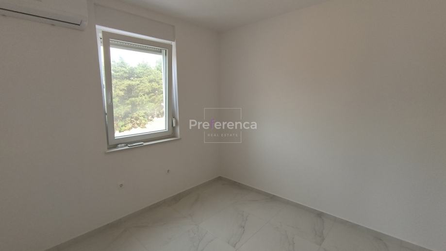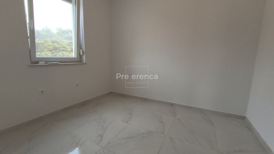 Stan se sastoji od ulaznog hodnika, wc-a, kupaonice, DVIJE SPAVAĆE SOBE, kuhinje/blagovaonice/dnevnog boravka i terase. U sklopu kuhinje nalazi se i spremište. Sa natkrivene terase izlazi se u vrt veličine 50m2 koji pripada stanu. Zgrada ima zajednički bazen veličine 32m2 sa prostorom za sunčanje obloženim u kamen. Stanu pripada jedno parkirno mjesto. Svaka prostorija je klimatizirana, vanjska stolarija PVC i aluminijske rolete na svim otvorima.
