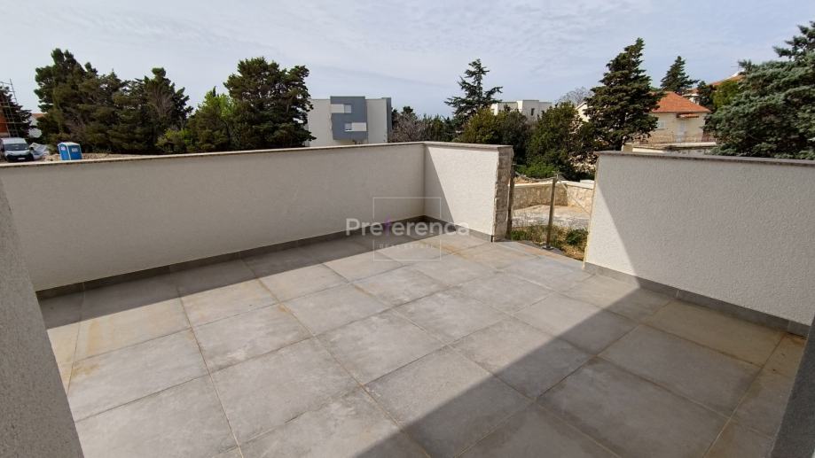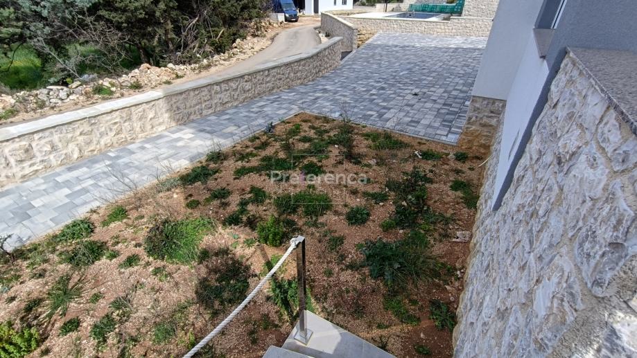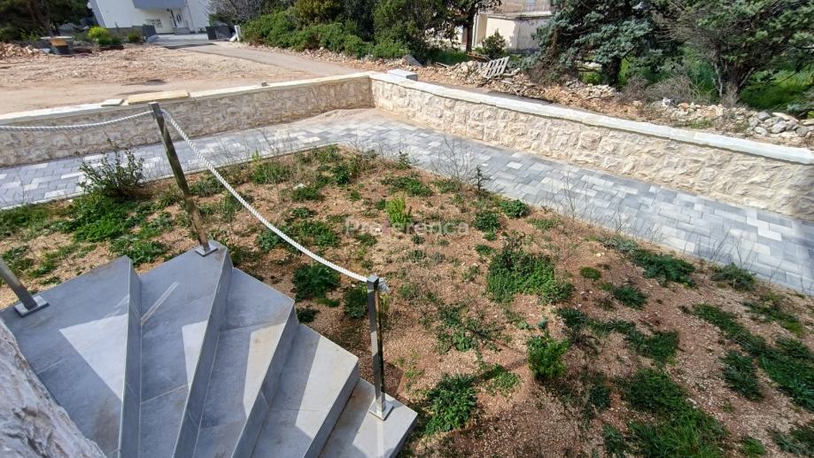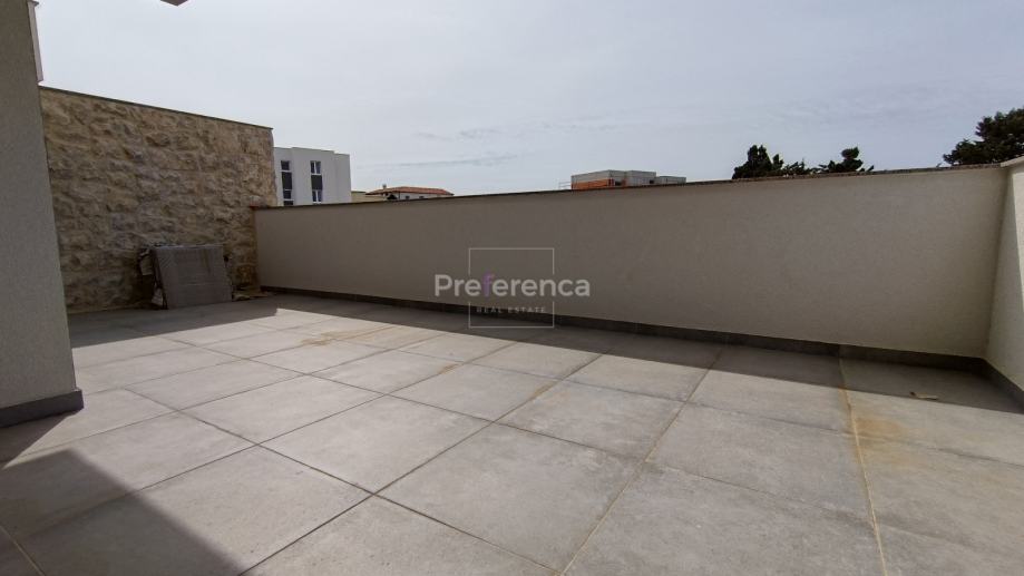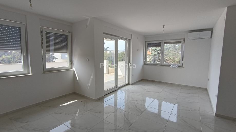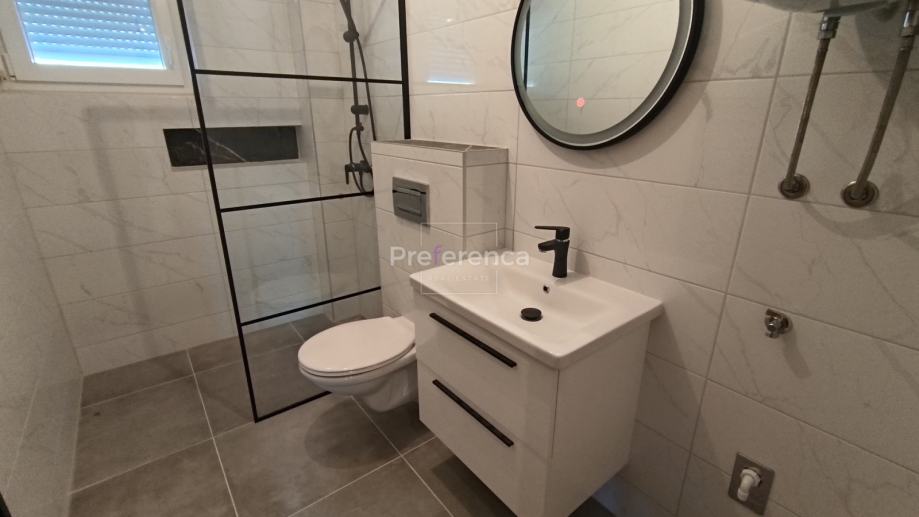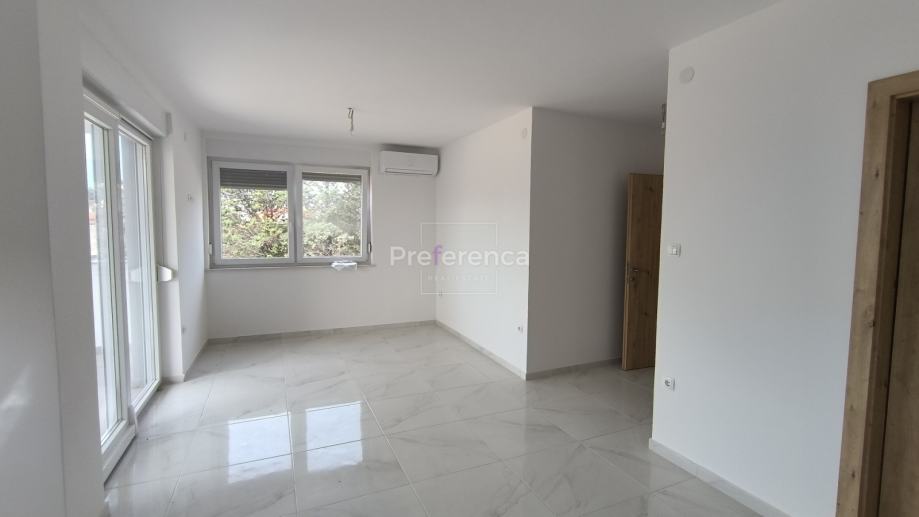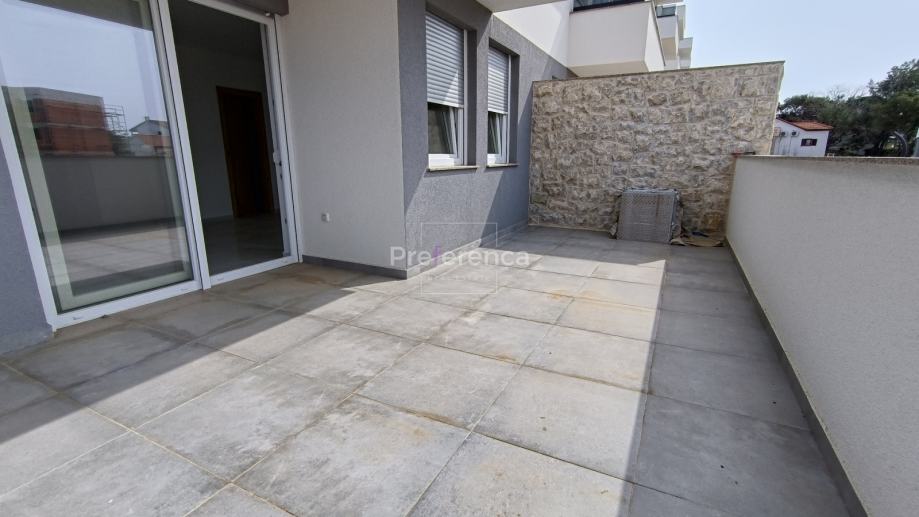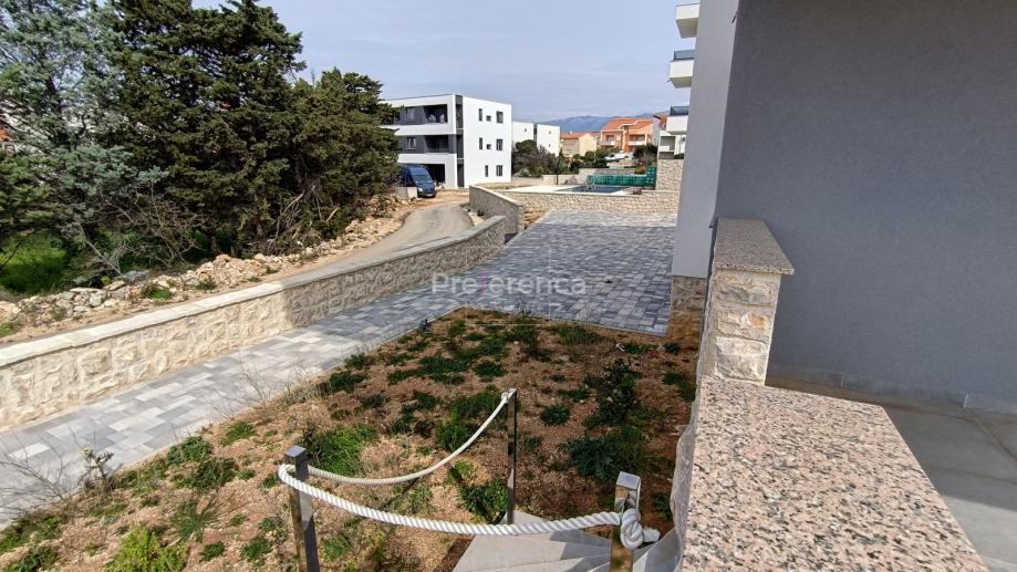 Stan se sastoji od ulaznog hodnika, wc-a, kupaonice, DVIJE SPAVAĆE SOBE, kuhinje/blagovaonice/dnevnog boravka i terase. U sklopu kuhinje nalazi se i spremište. Sa natkrivene terase izlazi se u vrt veličine 50m2 koji pripada stanu. Zgrada ima zajednički bazen veličine 32m2 sa prostorom za sunčanje obloženim u kamen. Stanu pripada jedno parkirno mjesto. Svaka prostorija je klimatizirana, vanjska stolarija PVC i aluminijske rolete na svim otvorima.
