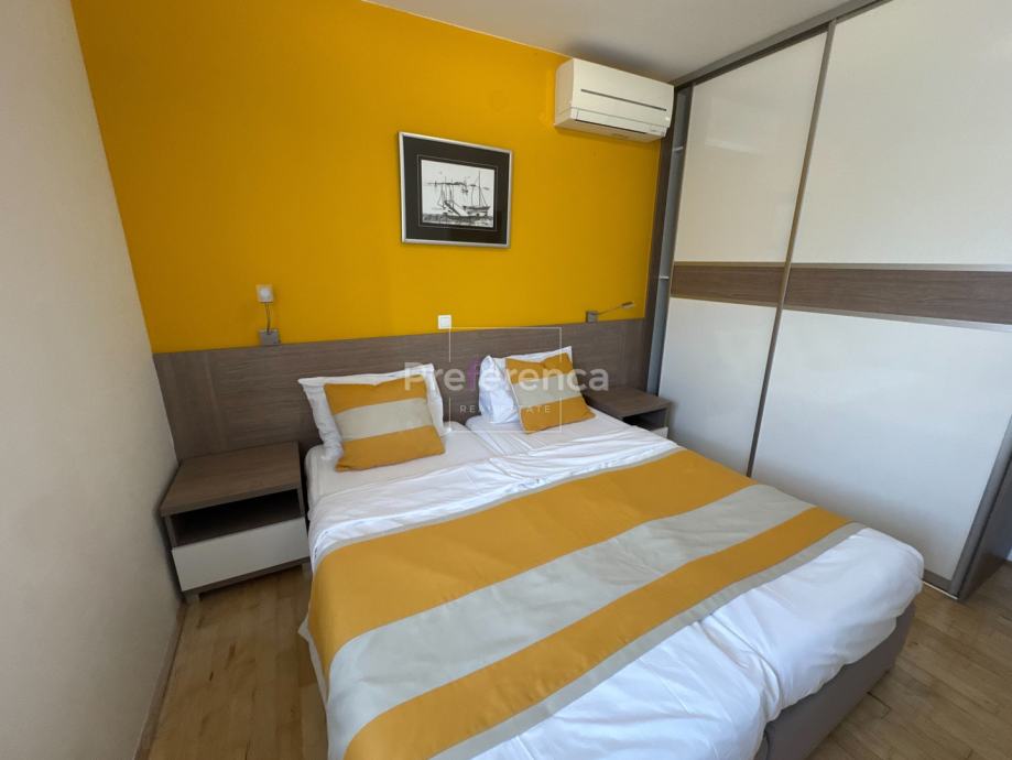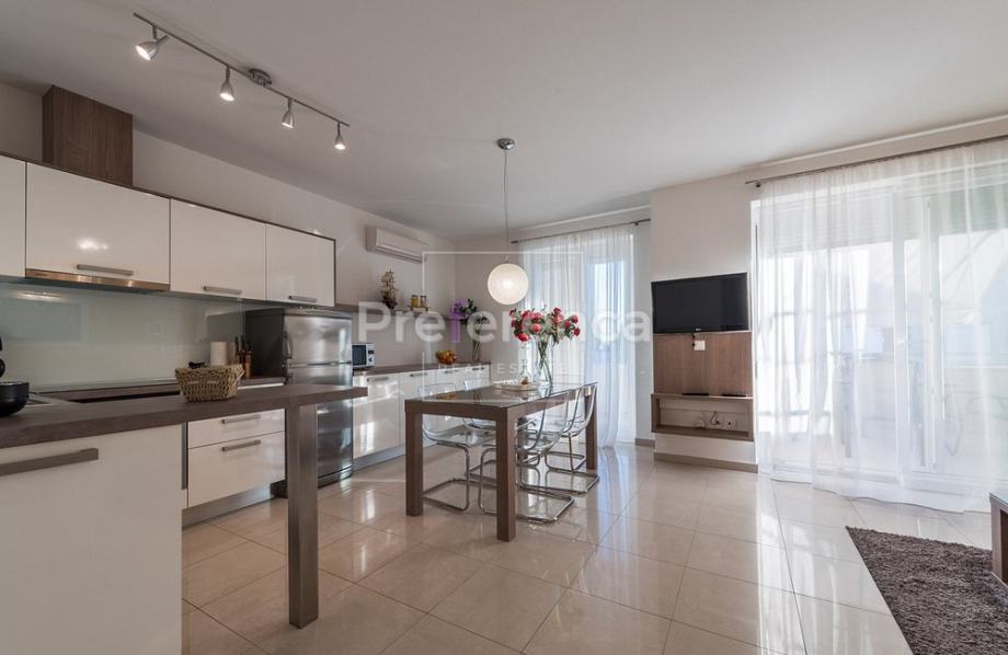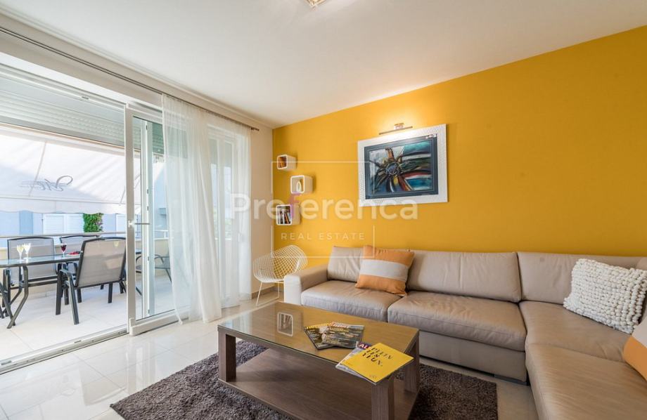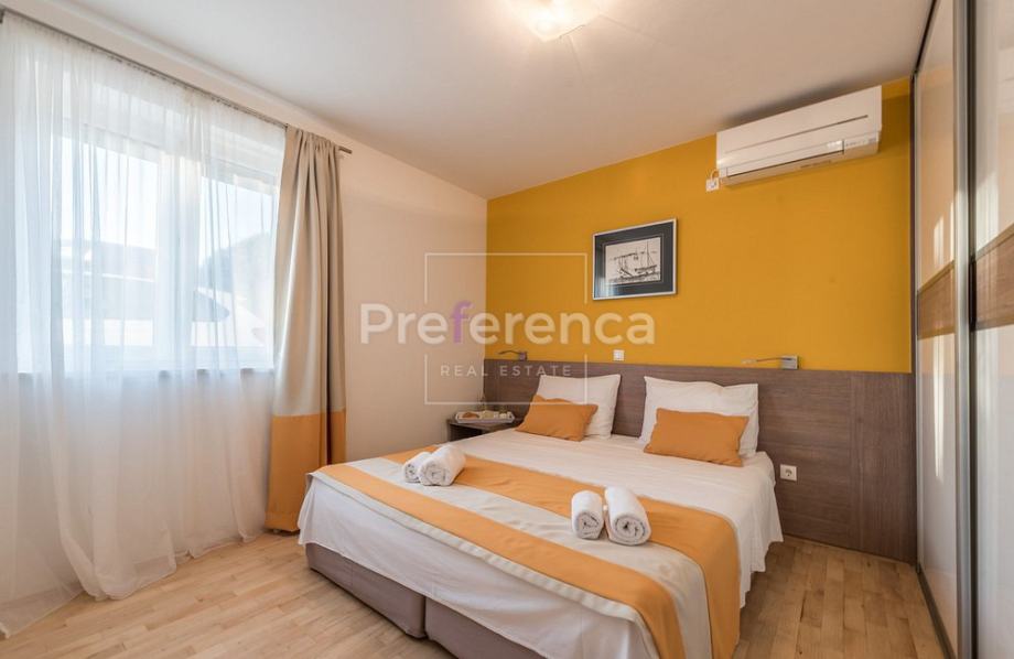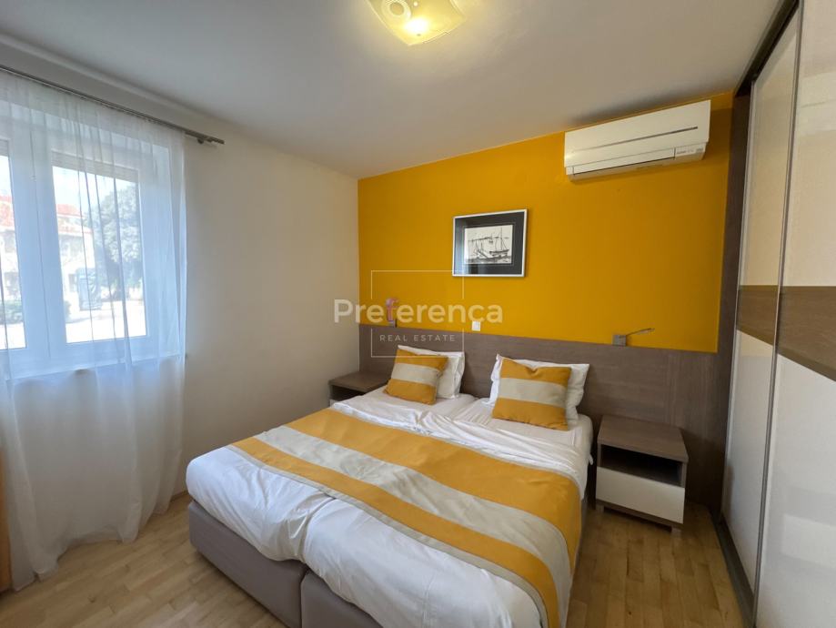 Ovaj stan se ističe svojom izuzetnom pozicijom, drugi red od mora, što pruža predivan pogled i puno sunčeve svjetlosti. Orijentacija prema sjeverozapadu dodatno doprinosi ugodnoj atmosferi unutar stana. Stan je opremljen klima uređajem za grijanje i hlađenje. Namješten je kvalitetnim namještajem po mjeri, spreman za useljenje.
