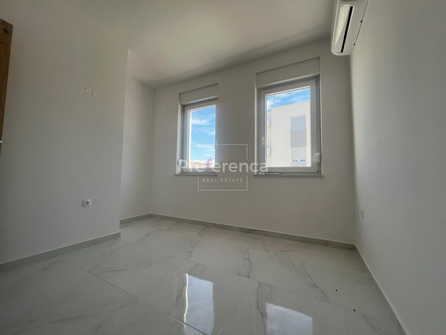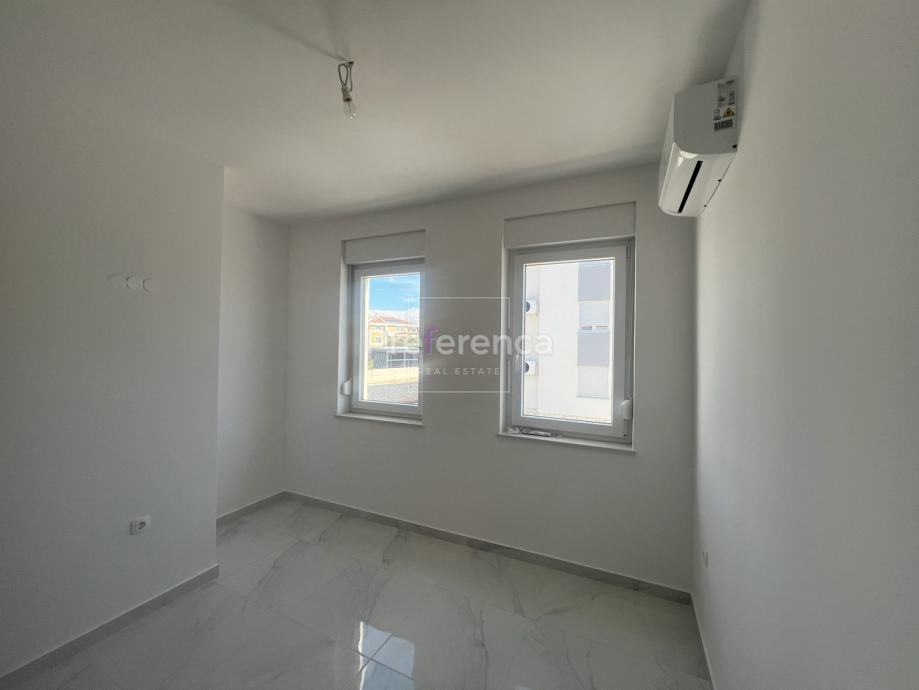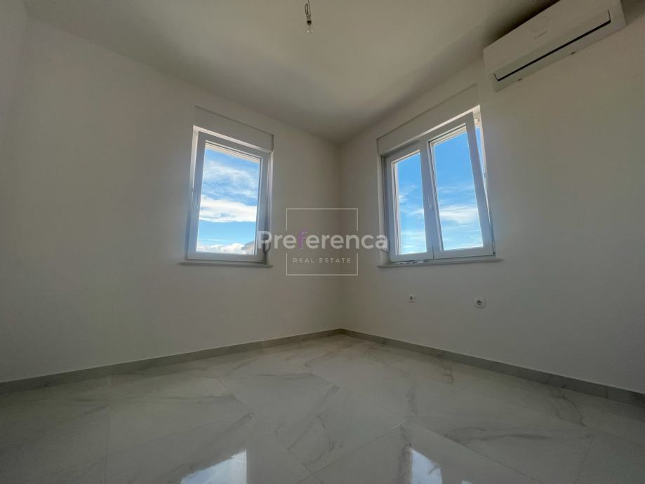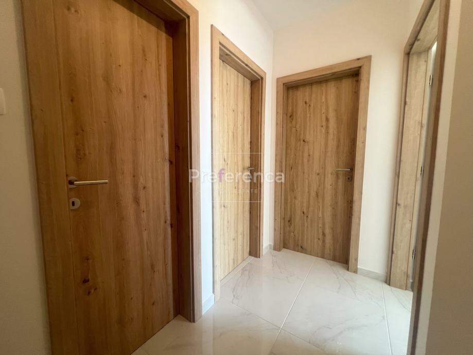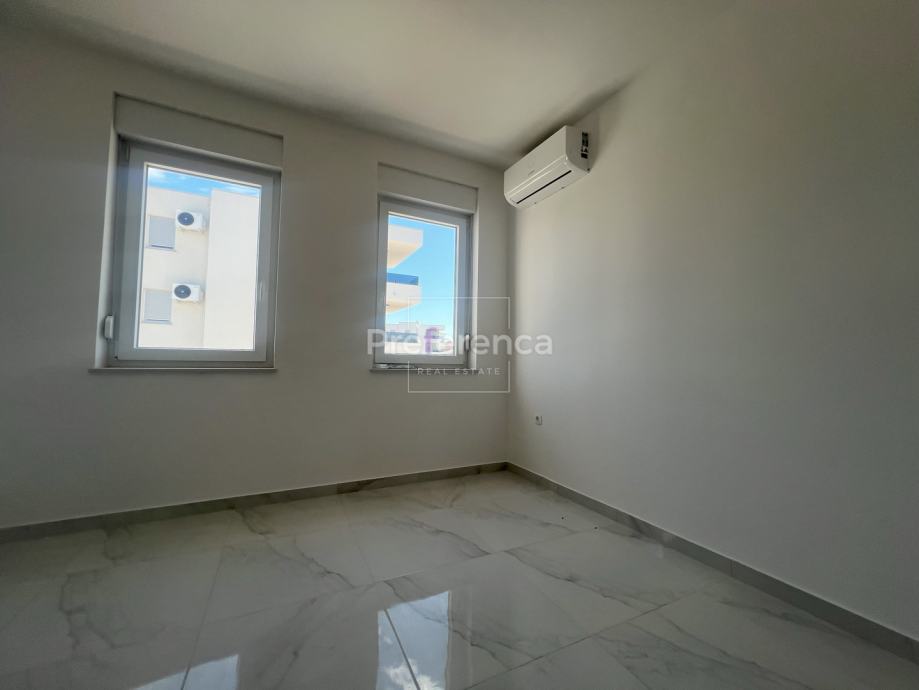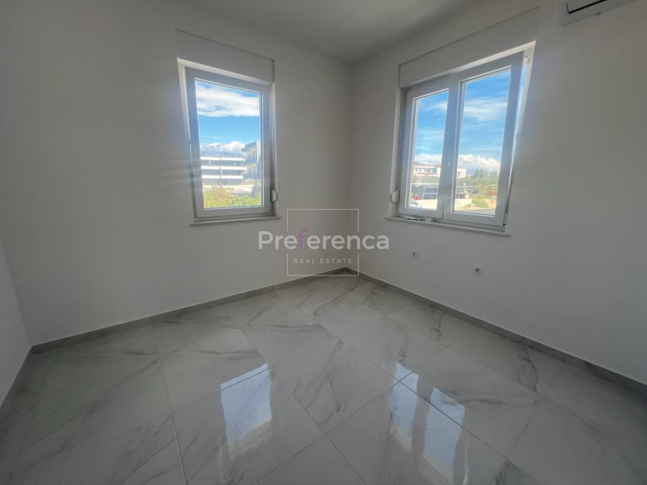 Stan se sastoji od ulaznog hodnika, wc-a, kupaonice, DVIJE SPAVAĆE SOBE, kuhinje/blagovaonice/dnevnog boravka i terase. U sklopu kuhinje nalazi se i spremište. Prostrana natrkivena terasa ima staklenu ogradu. Zgrada ima zajednički bazen veličine 32m2 sa prostorom za sunčanje obloženim u kamen. Stanu pripadaju DVA parkirna mjesto. Svaka prostorija je klimatizirana, vanjska stolarija PVC i aluminijske rolete na svim otvorima.