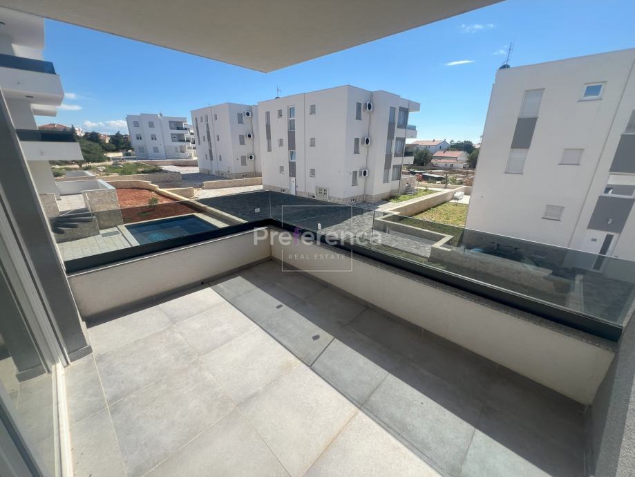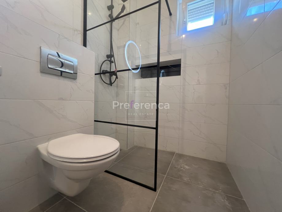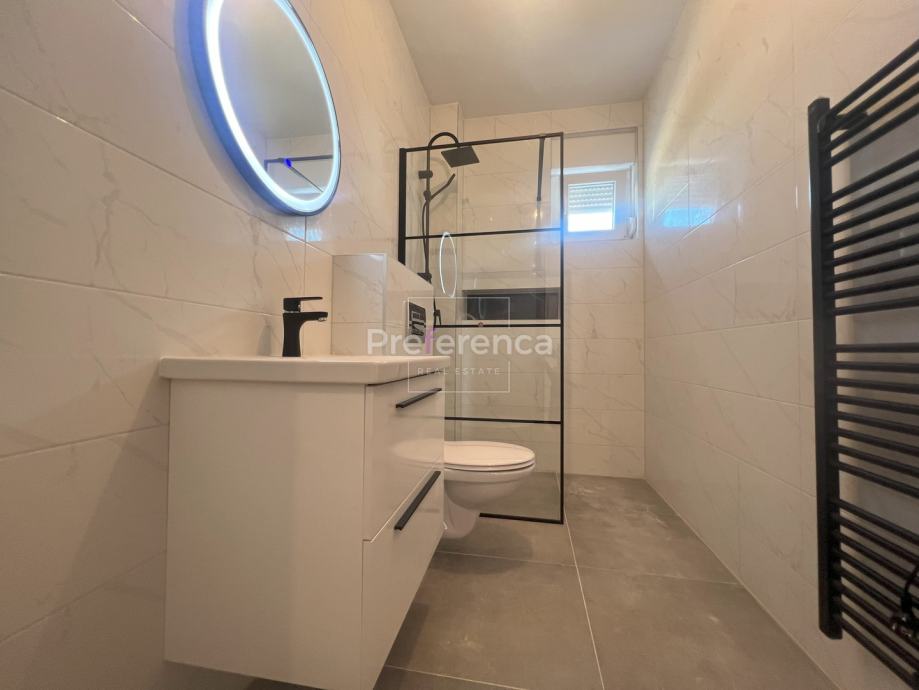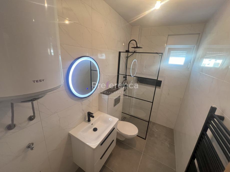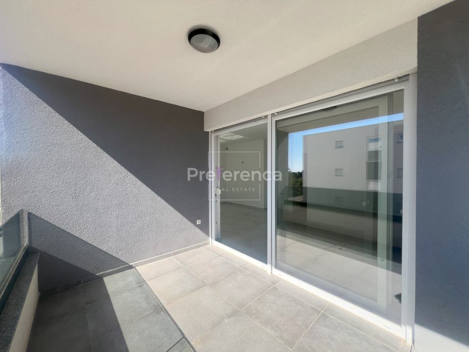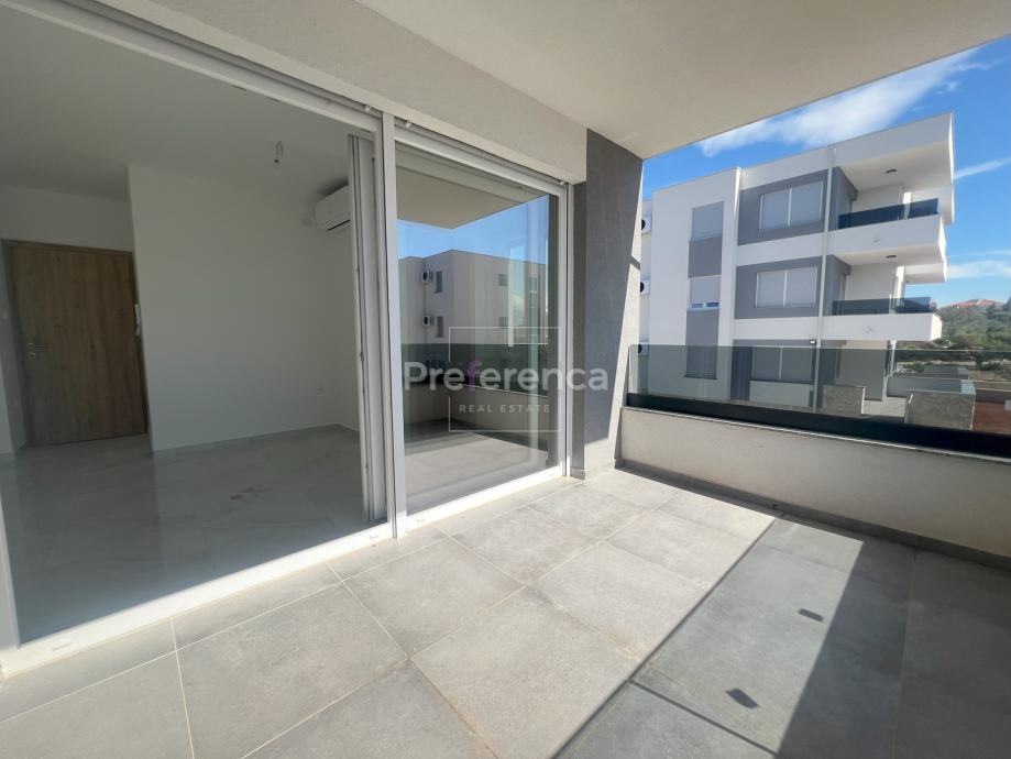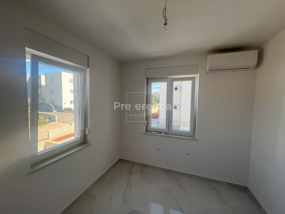 Stan se sastoji od ulaznog hodnika, wc-a, kupaonice, DVIJE SPAVAĆE SOBE, kuhinje/blagovaonice/dnevnog boravka i terase. U sklopu kuhinje nalazi se i spremište. Prostrana natrkivena terasa ima staklenu ogradu. Zgrada ima zajednički bazen veličine 32m2 sa prostorom za sunčanje obloženim u kamen. Stanu pripadaju DVA parkirna mjesto. Svaka prostorija je klimatizirana, vanjska stolarija PVC i aluminijske rolete na svim otvorima.