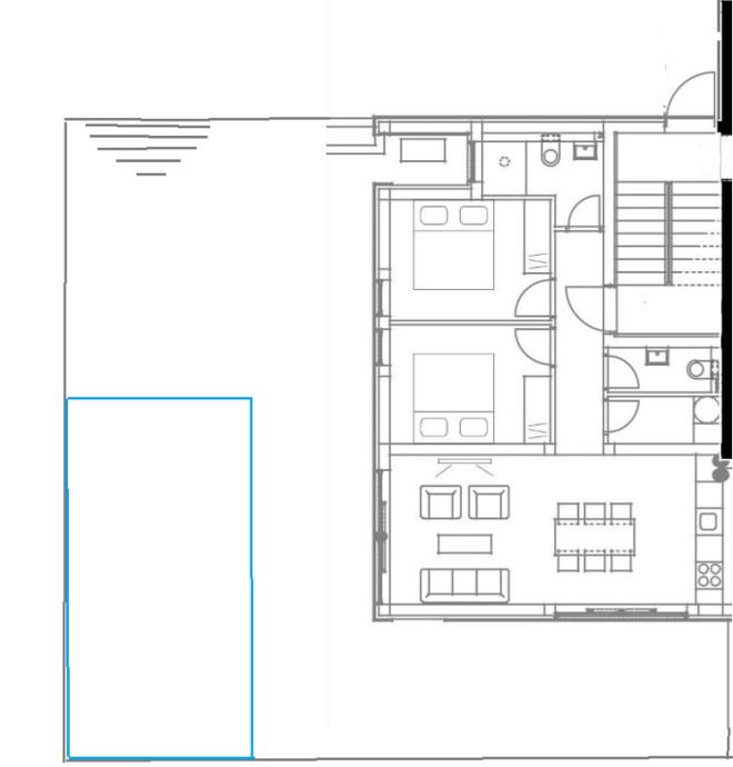 Sastoji se od ulaznog hodnika, 2 spavaće sobe, 2 kupaonice, spremišta, dnevnog boravka s kuhinjom i blagovaonom te dvorišta cca 90 m2 s bazenom površine cca 12 m2.