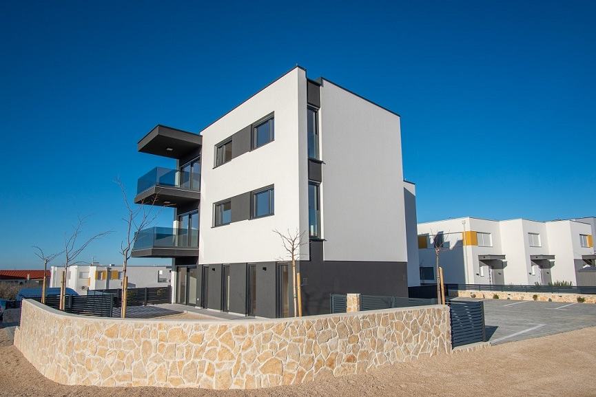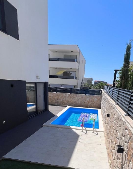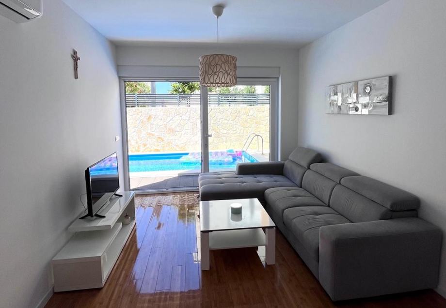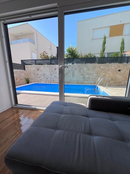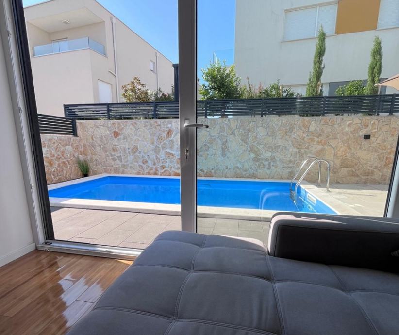 Prodaje se trosobni apartman s dvorištem i bazenom u prizemlju novije zgrade u Novalji, samo 400 metara od pješčane plaže Babe.