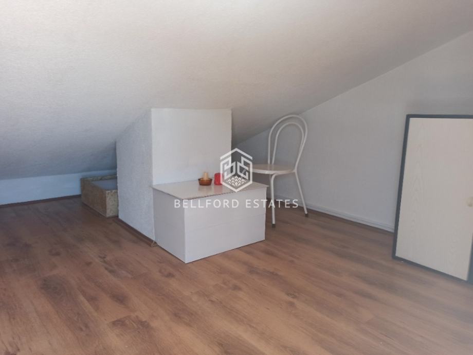 Na drugoj etaži, u potkrovlju, nalazi se prostrana spavaća soba dostupna polukružnim stepenicama iz dnevnog boravka. Iz potkrovlja se izlazi na ograđenu terasu s koje se pruža pogled na more.