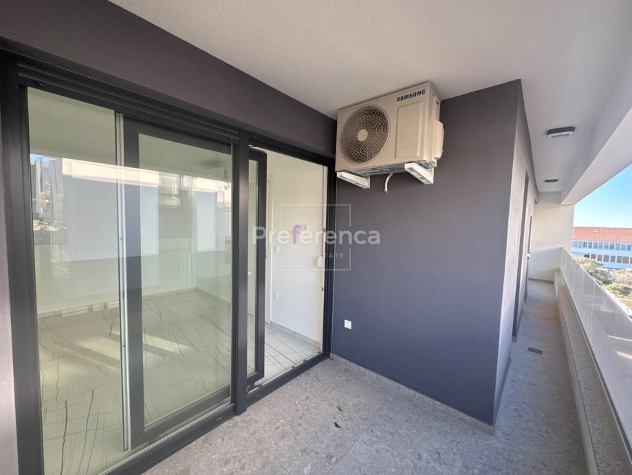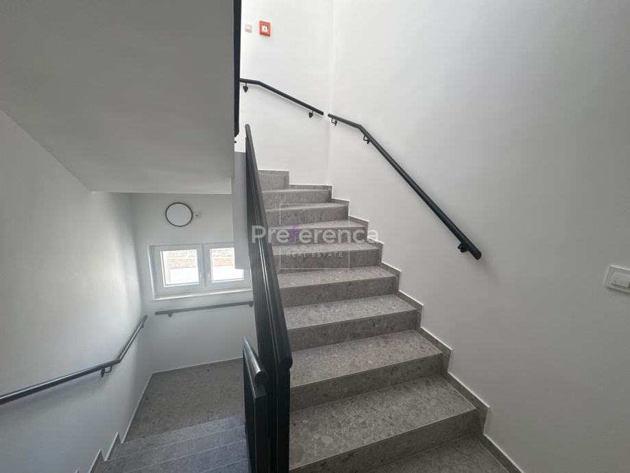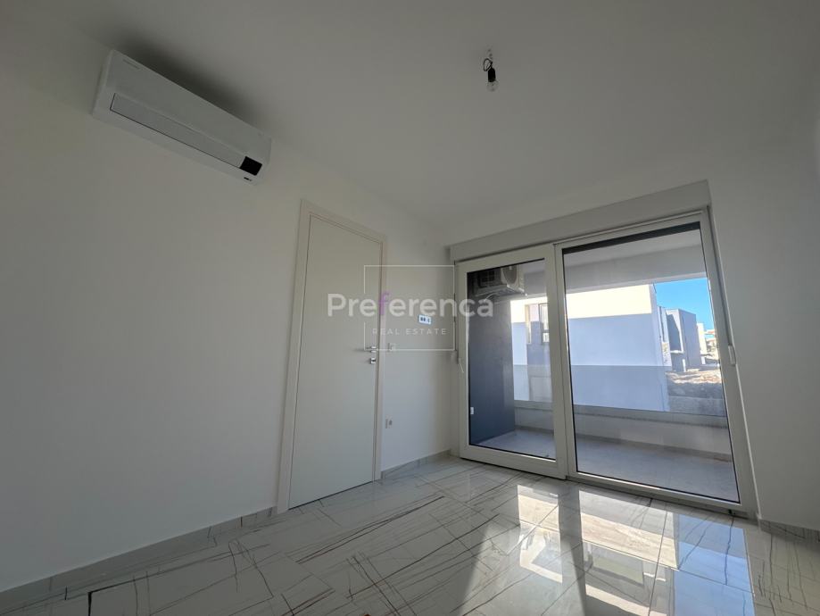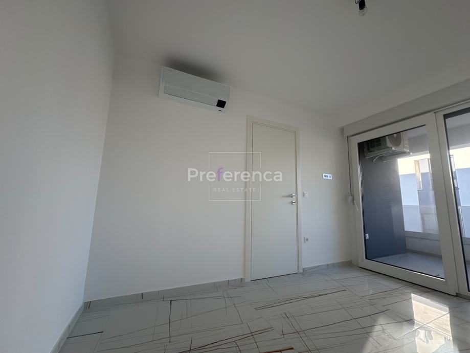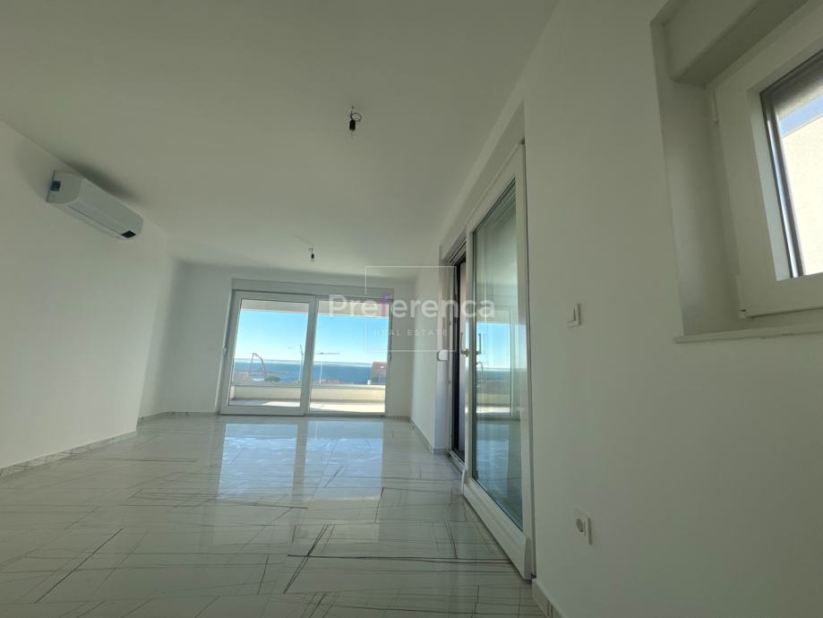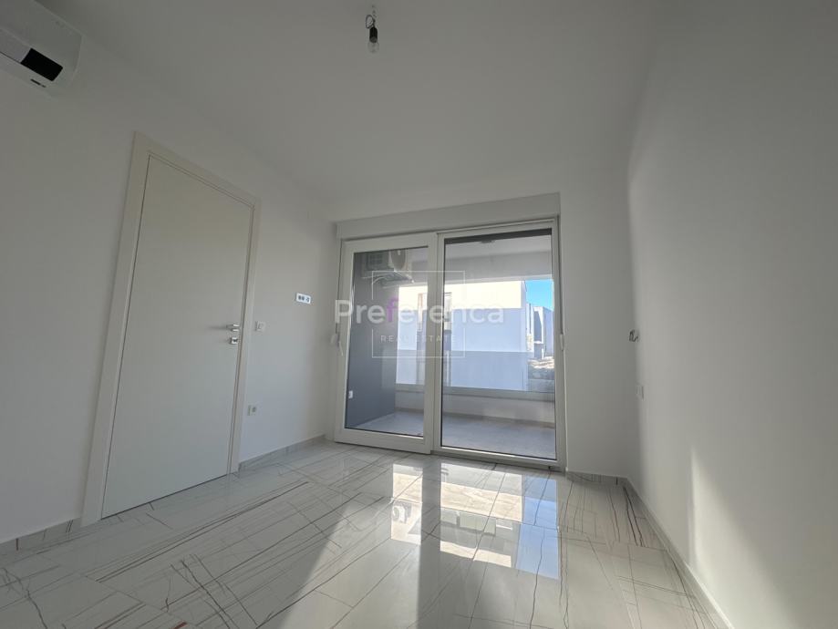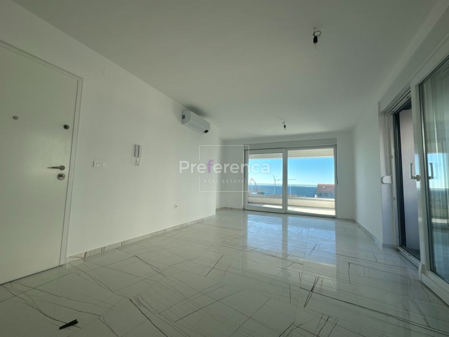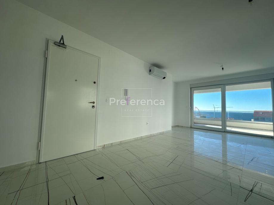 Stan se sastoji od jedne spavaće sobe, hodnika, kupaonice, kuhinje/dnevnog boravka/blagovaonice te dvije natkrivene terase. Zahvaljujući svojoj orijentaciji prema sjeverozapadu (SZ), stan je vrlo sunčan i nudi prekrasan pogled na more. Iz sobe, kupaonice i dnevnog boravka se izlazi na terasu koja se proteže cijelom sjevernom stranom stana. Sve prostorije su klimatizirane vrhunskim SAMSUNG klima uređajima, ugrađena kvalitetna sobna vrata sa magnetskim bravama i skrivenim okovima. Na svim vanjskim otvorima ugrađene podizne aluminijske rolete. Stan će biti djelomično opremljen sa kuhinjom s modernim aparatima, ugradbeni ormari, ormarić za obuću i garderobni ormari u spavaćim sobama te kupaonski namještaj već su osigurani, čime se pruža osnovna funkcionalnost.