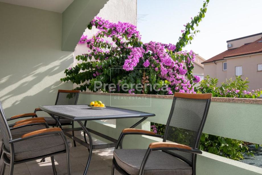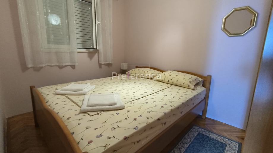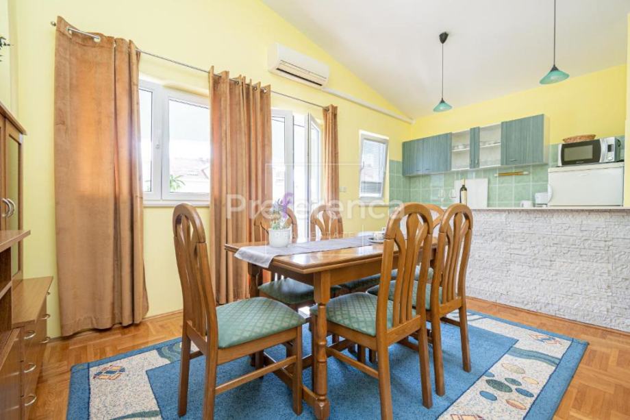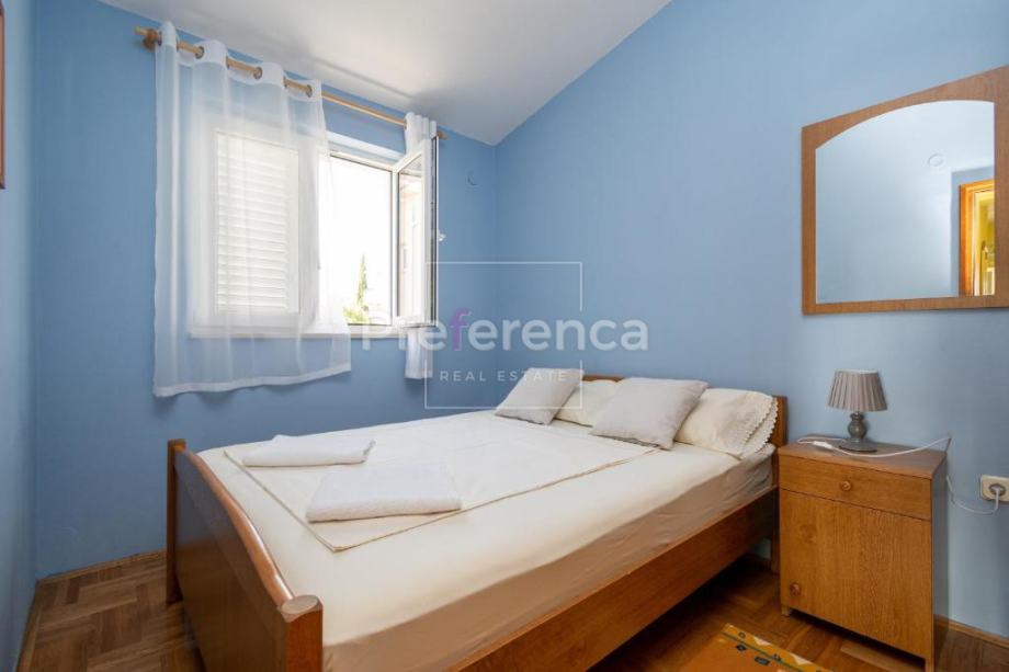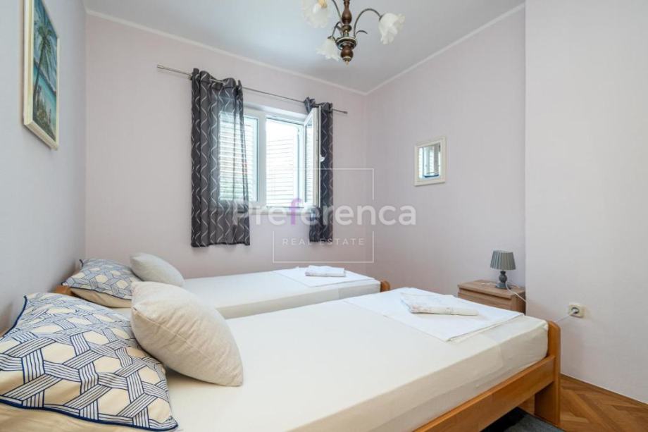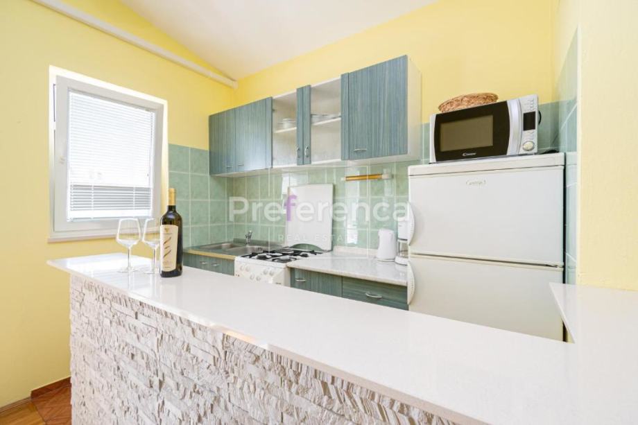 Svaki kat sastoji se od jedne prostrane apartmanske jedinice. U prizemlju se nalazi jednosoban stan kojeg čini natkrivena terasa, kuhinja i dnevni boravak, spavaća soba i kupaonica. Natkrivena terasa u potpunosti je zatvorena ALU stolarijom te se koristi kao blagovaonica. Vanjske stepenice vode do prvog kata gdje se nalazi DVOSOBAN apartman. Sastoji se od dvije spavaće sobe, kupaonice, spremišta, dnevnog boravka i blagavaonice sa kuhinjom. Iz dnevnog boravka izlazi se na prostranu natkrivenu terasu sa koje se pruža pogled na more.