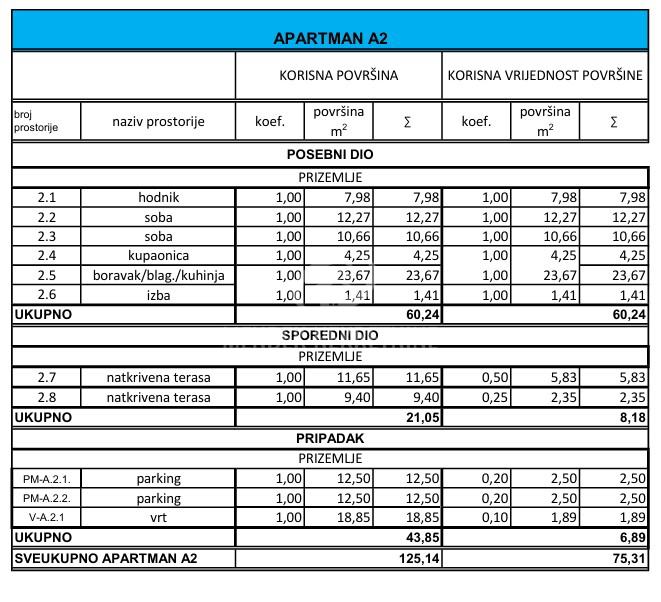 Prodaje se apartman A2 u prizemlju, koji se sastoji od: kuhinje/blagovaonice/dnevnog boravka, wc/kupaonice, dvije sobe i izbe, ukupne korisne površine 60,24 m2 kojem pripada sporedni dio dvije natkrivene terase u prizemlju površine 21,05 m2, te pripadak u dvorištu: dva parkirna mjesta površine po 12,50 m2 i vrt površine 18,85 m2; sveukupne korisne površine 125,14 m2 - neto obračunske površine 75,31 m2