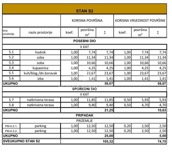Prodaje se stan S2 na 2. katu, koji se sastoji od: kuhinje/blagovaonice/dnevnog boravka, wc/kupaonice, dvije sobe i izbe, ukupne korisne površine 59,07 m2 kojem pripada sporedni dio dvije natkrivene terase površine 21,25 m2, te pripadak u dvorištu: dva parkirna mjesta površine po 12,50 m2; sveukupne korisne površine 105,32 m2 - neto obračunske površine 74,70 m2