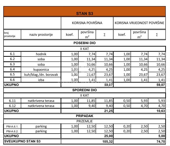 Prodaje se stan S2 na 2. katu, koji se sastoji od: kuhinje/blagovaonice/dnevnog boravka, wc/kupaonice, dvije sobe i izbe, ukupne korisne površine 59,07 m2 kojem pripada sporedni dio dvije natkrivene terase površine 21,25 m2, te pripadak u dvorištu: dva parkirna mjesta površine po 12,50 m2; sveukupne korisne površine 105,32 m2 - neto obračunske površine 74,70 m2