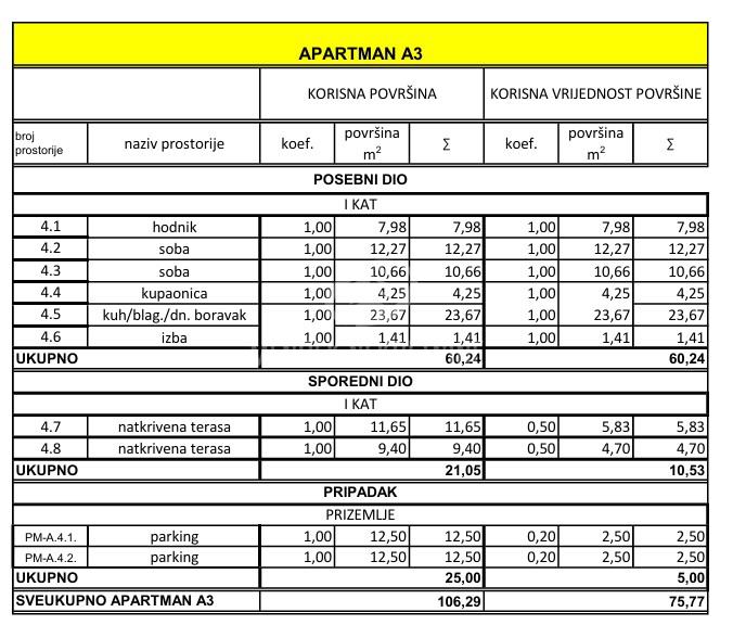 Prodaje se apartman A3 na 1. katu, koji se sastoji od: kuhinje/blagovaonice/dnevnog boravka, wc/kupaonice, dvije sobe i izbe, ukupne korisne površine 60,24 m2 kojem pripada sporedni dio dvije natkrivene terase površine 21,05 m2, te pripadak u dvorištu: dva parkirna mjesta površine po 12,50 m2; sveukupne korisne površine 106,29 m2 - neto obračunske površine 75,77 m2