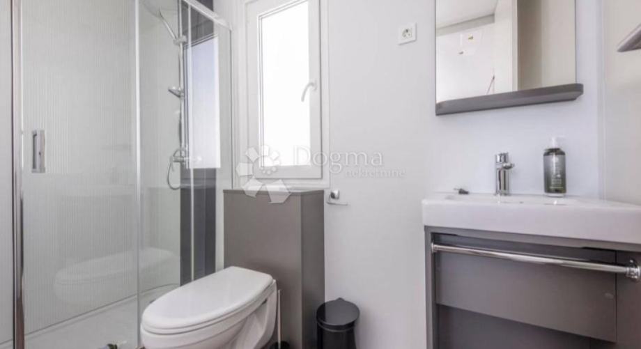 Svaka od dvije kupaonice opremljena je svim potrebnim toaletnim priborom za vašu udobnost. Vanjski prostor ove kućice je posebno impresivan - prostrana kamena terasa, površine 24 m2, natkrivena bioklimatskom pergolom, pruža savršeno mjesto za opuštanje s pogledom na more. Garnitura za sjedenje, stol i stolice za blagovanje omogućuju uživanje u otvorenom prostoru u bilo koje doba dana.