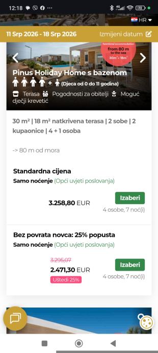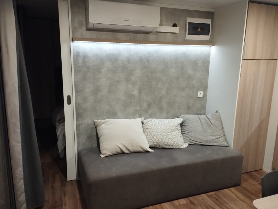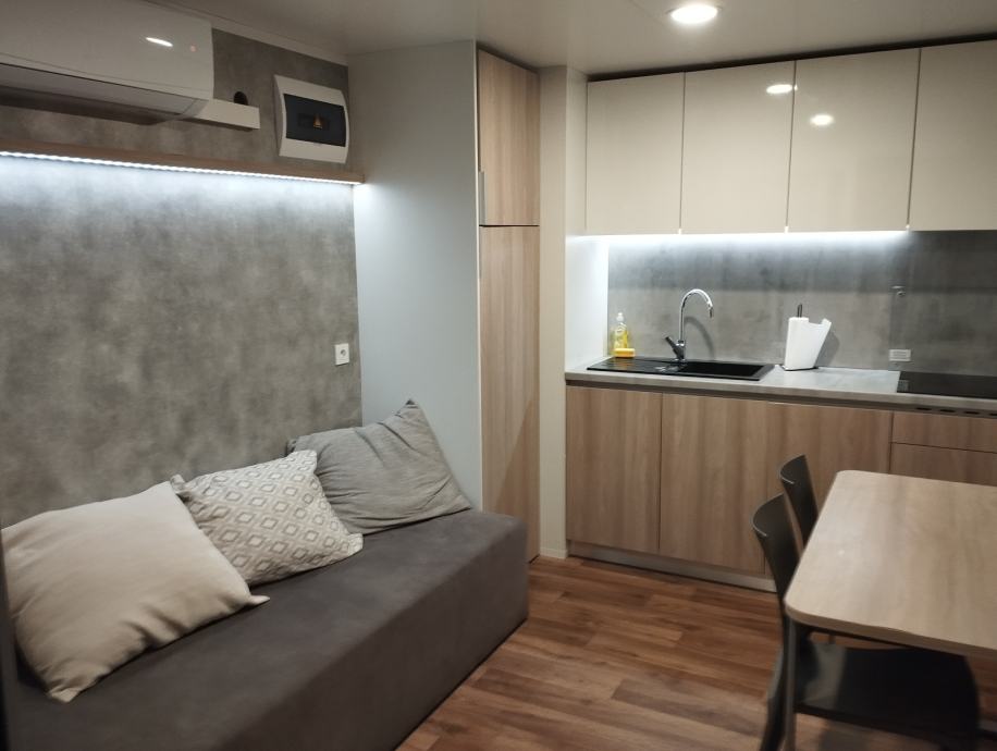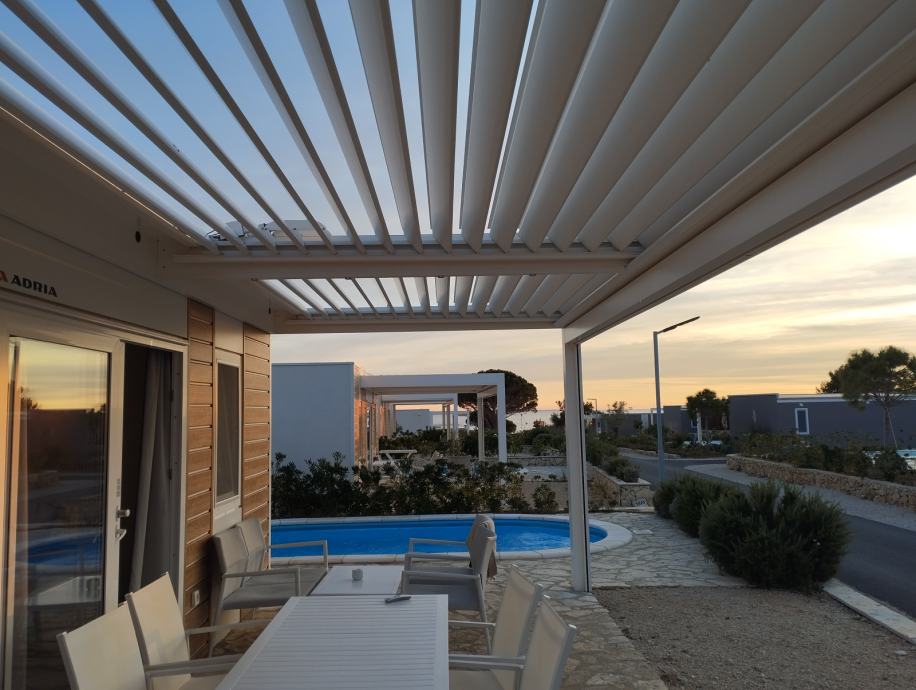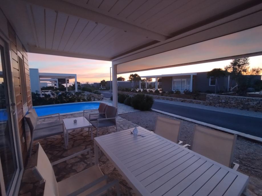 Prodajem mobilnu kućicu Adria V line, smještenu u kampu Terra park phalaris kod Novalje.Kućica na 30 m2 sa dvije spavače sobe, dvije kupaonice,opremljenom kuhinjom,dnevnim boravkom,natkrivenom( bio klimatska pergola) i popločanom terasom(18 m2), privatnim grijanim bazenom( 18 m2), sa pogledom na more( udaljenost od plaže 80 m).Terasa je sa lounge setom,ležaljkama i stolom sa stolicama.