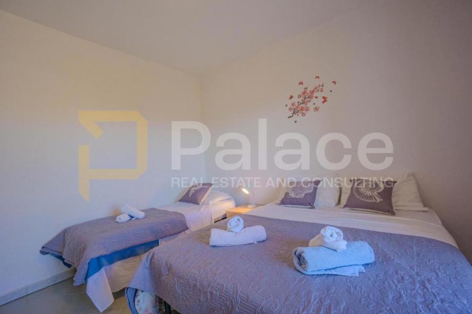 Posebna vrijednost ove nekretnine je privatni pristup plaži – vlastiti put vodi izravno do uređene, sigurne i čiste plaže, savršene za djecu i opušteno uživanje u moru. Stan se prostire na ukupno 96,15 m² korisne površine, a sastoji se od dvije spavaće sobe, kupaonice, prostranog dnevnog boravka s blagovaonicom i kuhinjom. Iz dnevnog dijela izlazi se na natkrivenu terasu s pogledom na more.
