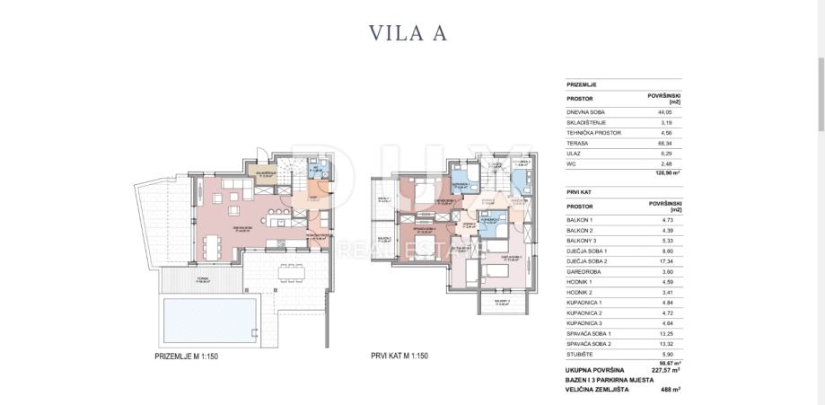 Sastoji se od prostranog dnevnog prostora sa kuhinjom i blagovaonicom, spremišta, wc-a i prostrane terase dok su na 1. katu 4 spavaće sobe, tri kupaonice, garderoba i tri balkona.