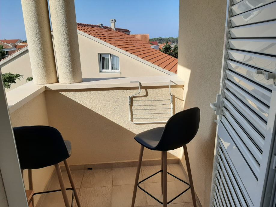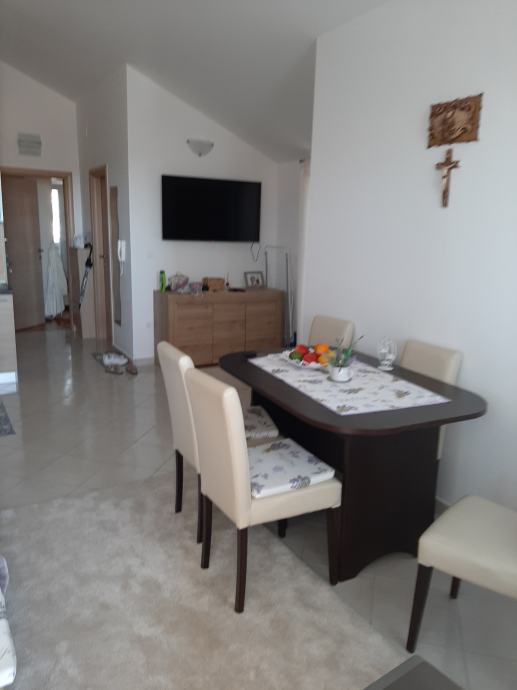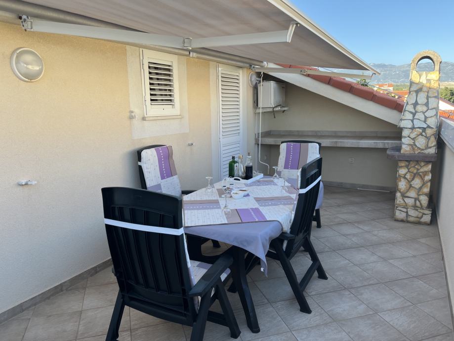 Apartman ima dvije lođe i veliku terasu od 20 m2 s tendom od 4 m Pripada mu i veliko parkirno mjesto.