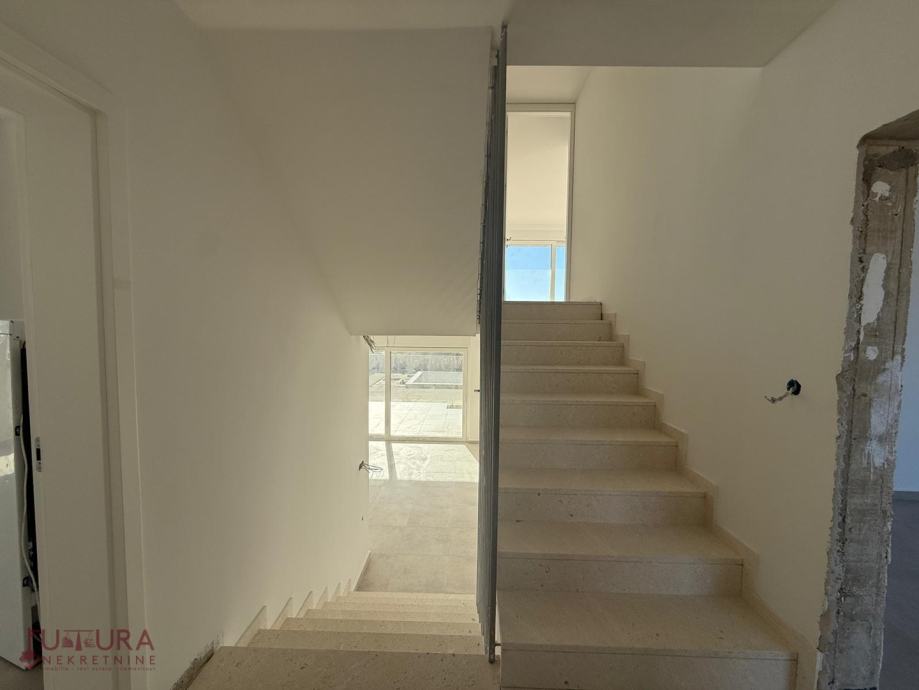 Prizemlje: dnevni boravak + kuhinja + blagovana, hodnik, kupaonica, wc, ostava, sauna i dvije natkrivene terase.