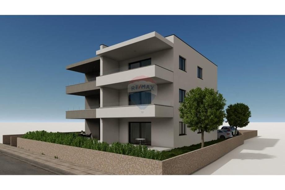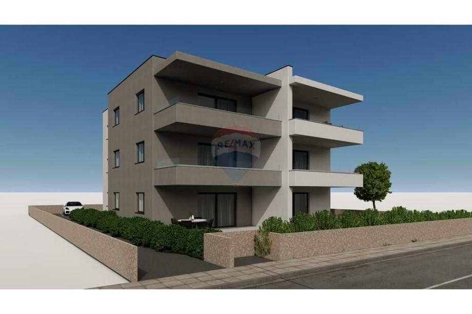 Novalja - Gaj. Prodaje se luksuzan trosoban stan u prizemlju sa terasom (ukupno 85,68m2), vrtom i dva parkirna mjesta. Stan se sastoji od ulaznog hodnika, DVIJE spavaće sobe, DVIJE kupaonice, ostave, kuhinje, blagovaonice i dnevnog boravka sa izlazom na prostranu terasu (18,20m2) i privatni vrt (134,56m2).