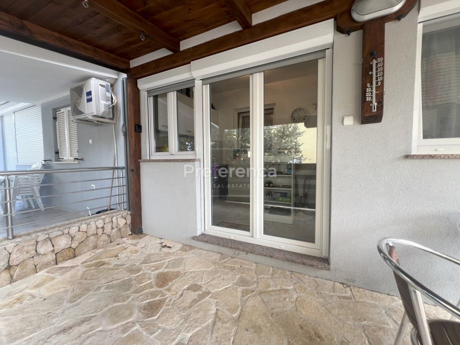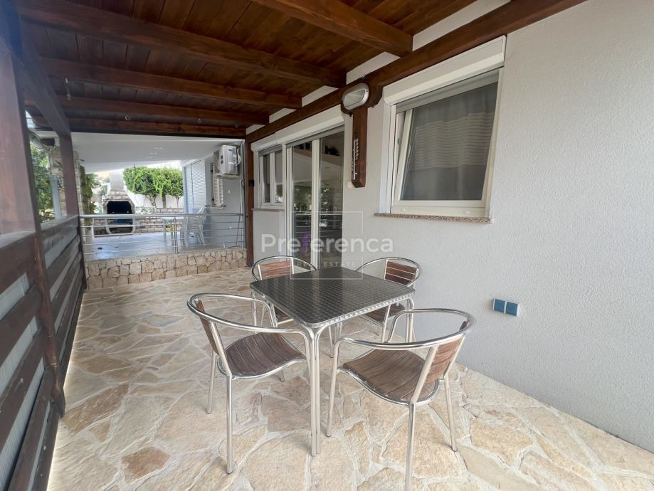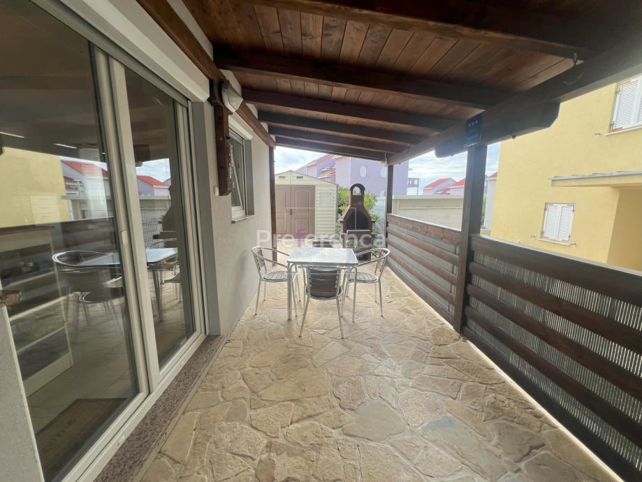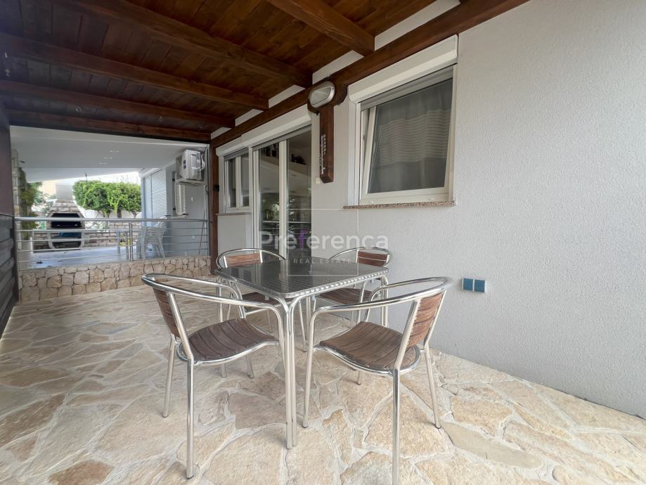 Stan se sastoji od ulaznog hodnika, dvije spavaće sobe, kupaonice, dnevnog boravka, kuhinje s blagovaonicom, prostrane natkrivene terase, vrta te spremišta. Opremljen je klima uređajem. Stanu pripada jedno parkirno mjesto.