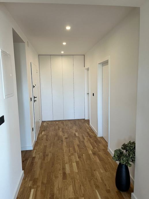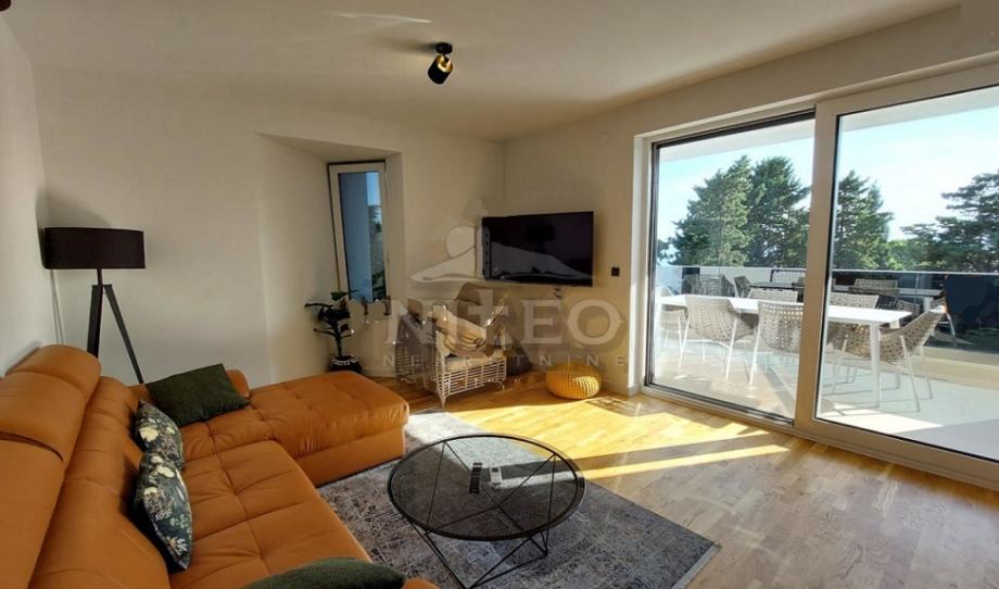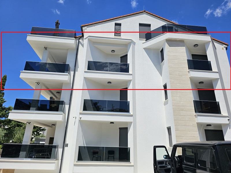 Sastoji se od hodnika, predprostora, 2 sobe, dnevnog boravka s kuhinjom, 2 wc-a s kupaonom, wc-a, 2 lođe i velike natkrivene terase s pogledom na more. Sveukupne površine 108.83 m2.