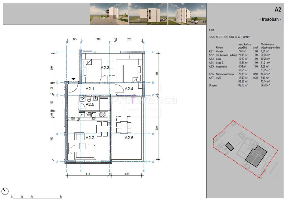 - vlastitog parkirnog mjesta – 12,5 m2 (obračunski 3,13 m2)
