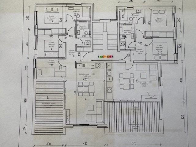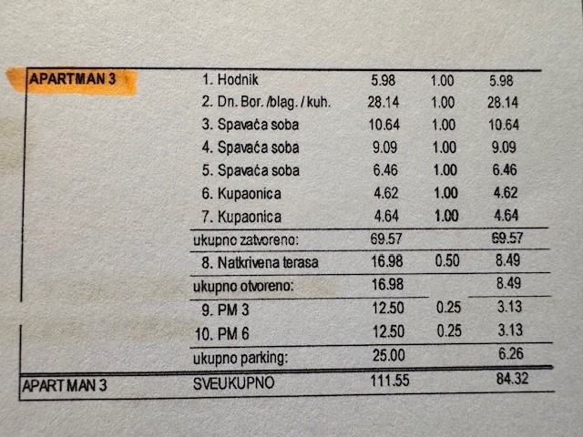 Prodaje se apartman oznake A2 na prvom katu stambene zgrade, dok u ponudi imamo identičan stan oznake A3 koji se nalazi na drugom katu iste zgrade - podna površina pojedinog stana (zatvoreno) je 69,57 m2+ natkrivena terasa 16,98 m2+ 2 parkirna mjesta 25,00 m2 sveukupno iznosi 111,55 m2 dok je za obračun sa odbijenim koeficijentima korisna površina = 84,32 m2.