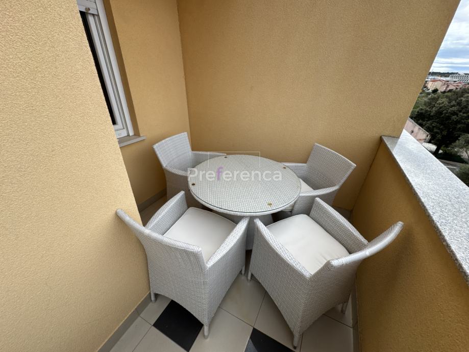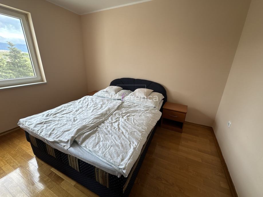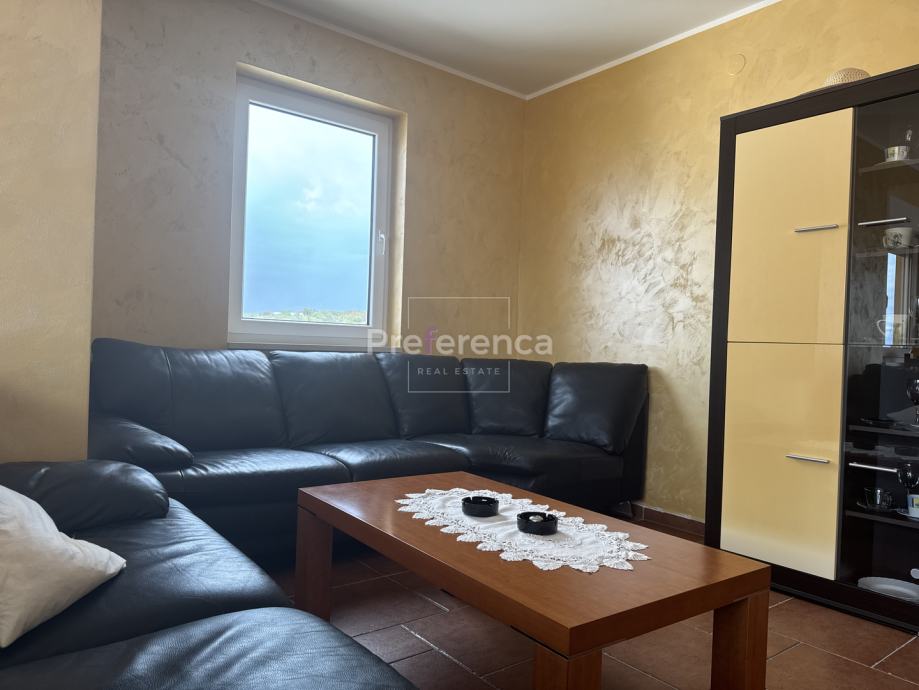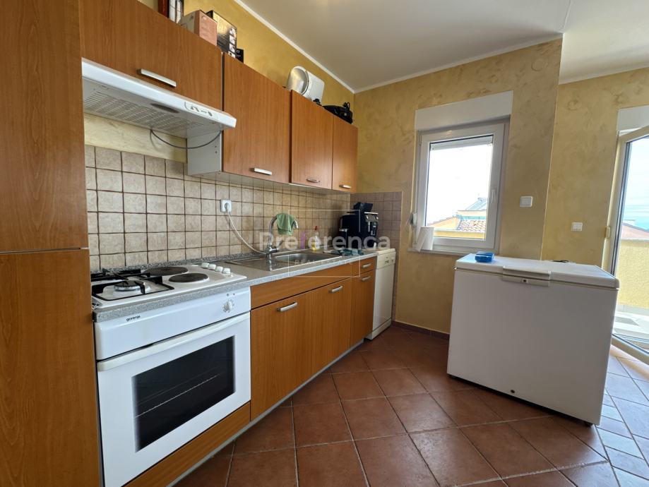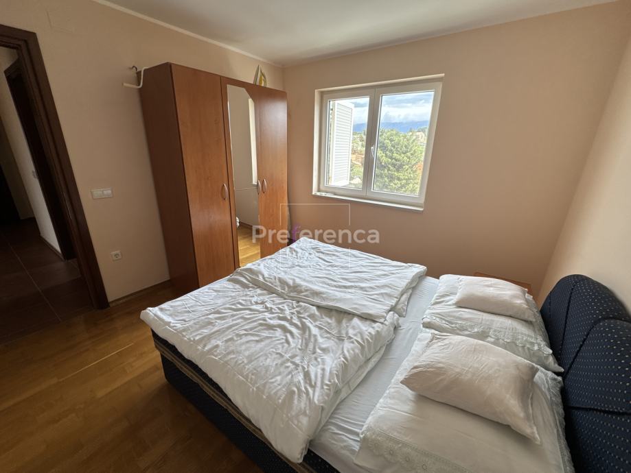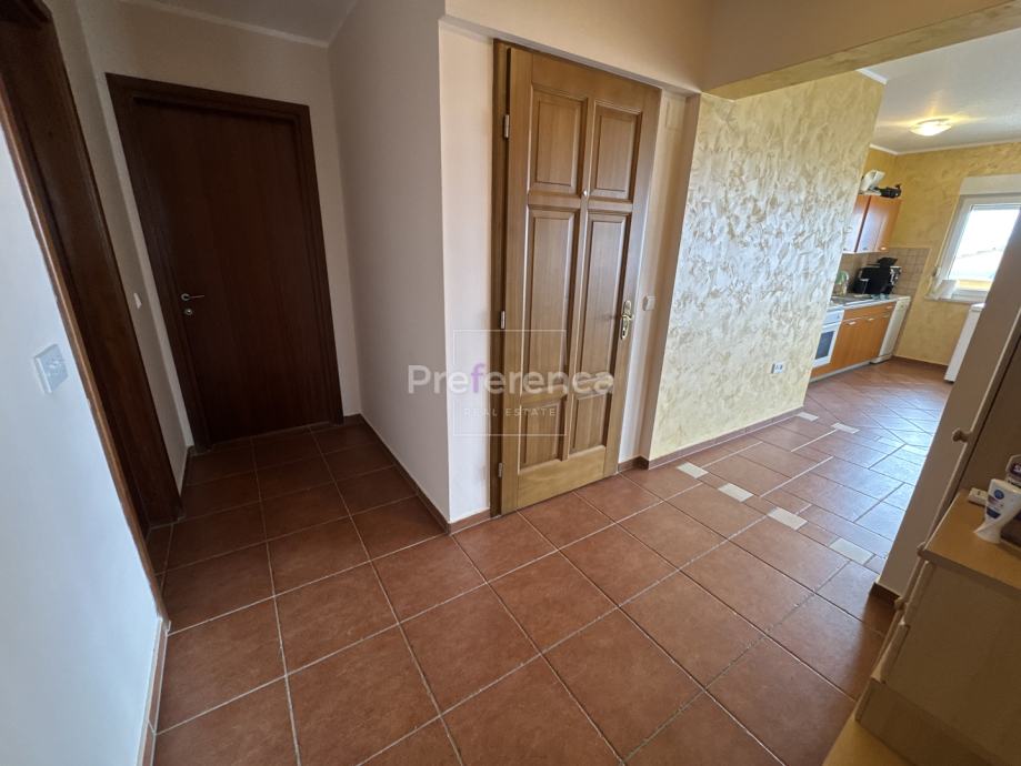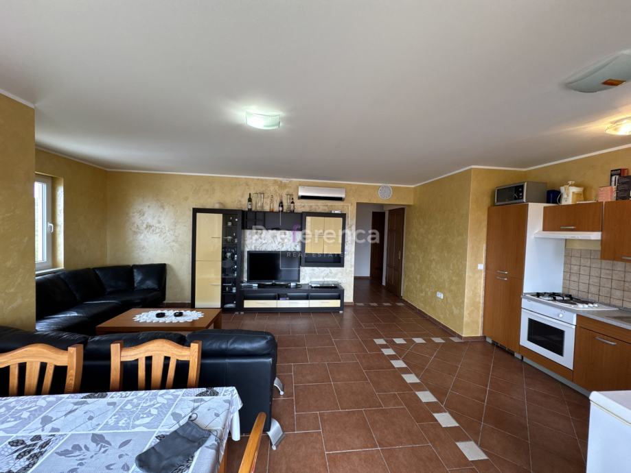 Ova nekretnina izgrađena je 2007. godine i nalazi se na izuzetno sunčanoj lokaciji s prekrasnim pogledom na more. Stan je orijentiran prema sjeverozapadu, što omogućuje obilje prirodne svjetlosti tijekom većeg dijela dana te pruža uživanje u panoramskim vizurama. Sastoji se od ulaznog hodnika, TRI spavaće sobe, DVIJE kupaonice, kuhinje/blagovaonice/dnevnog boravka i terase. Sa terase se pruža pogled na more. Kuhinja je opremljena svim potrebnim aparatima, uključujući perilicu posuđa, dok su u stanu također dostupni perilica rublja, kada i TV, što ga čini potpuno funkcionalnim za svakodnevni život.