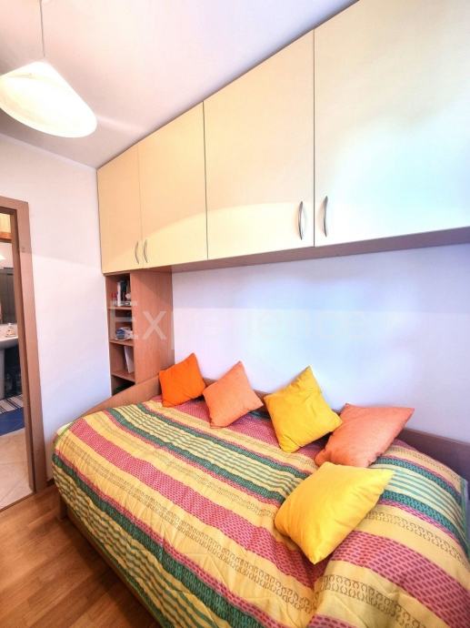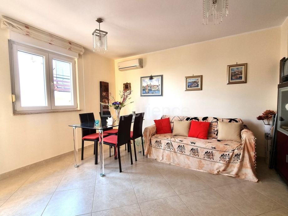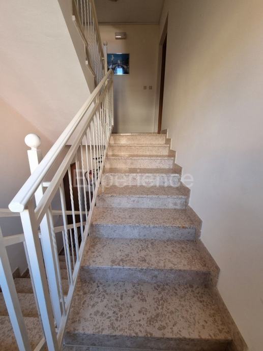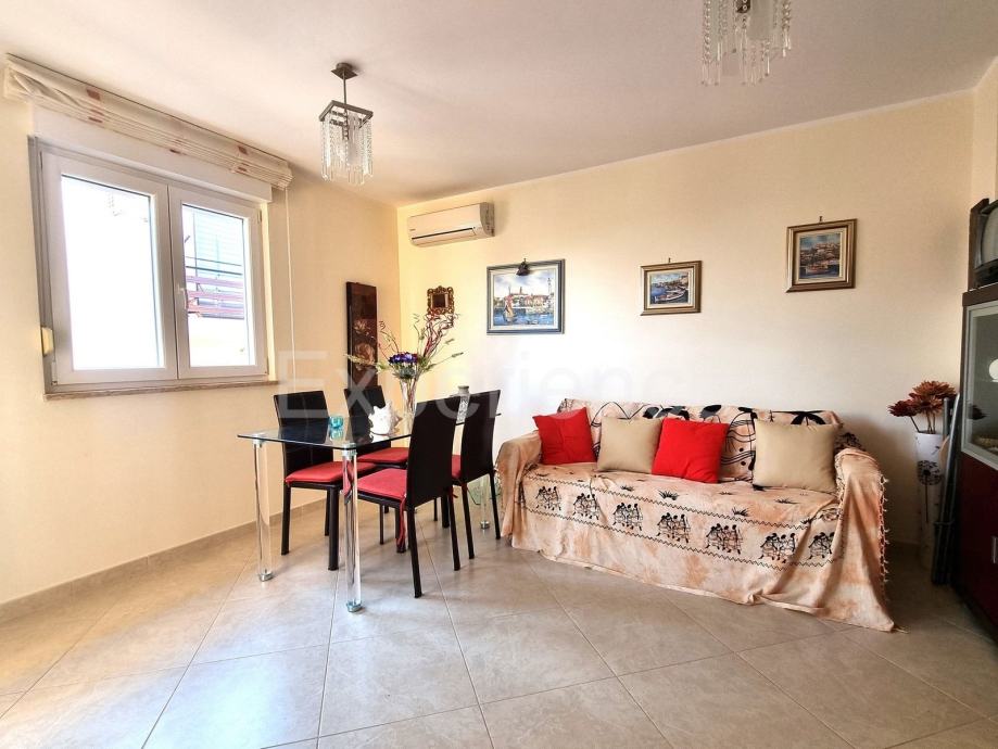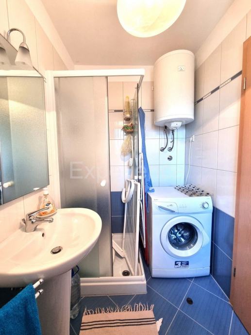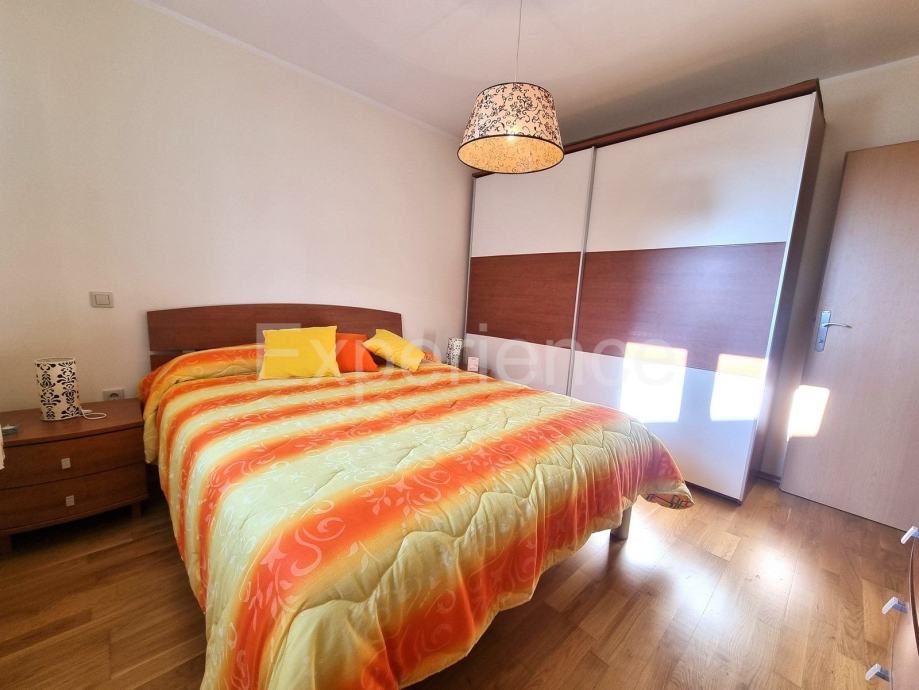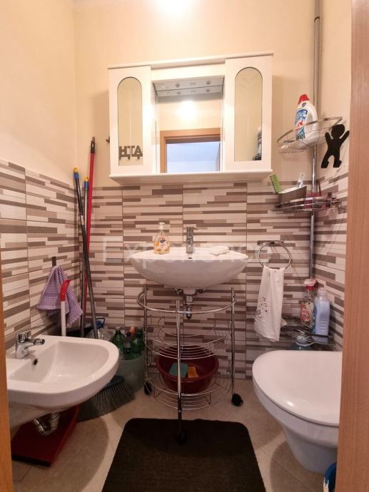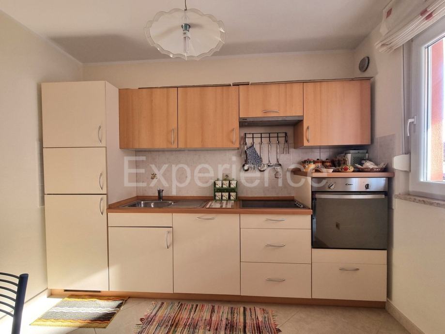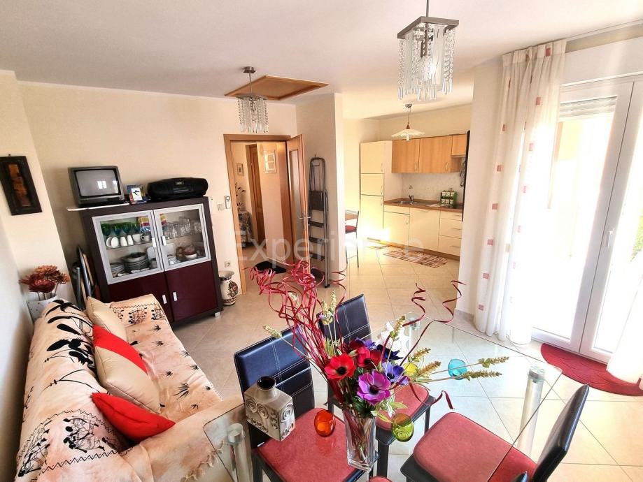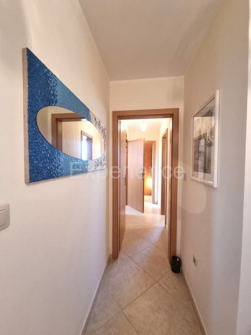 Stan od 58 m2 nalazi se na 1. katu manje zgrade od samo 5 stanova, 500 m od uređenih plaža i sadržaja grada. Izgrađena je 2009. godine. Odličnog je rasporeda i orijentacije. Sastoji se od ulaznog hodnika, WC-a, dnevnog prostora (dnevnog boravka, blagovaone i kuhinje) sa izlaskom na balkon sa kojeg se pruža pogled na more. Spavaći dio je potpuno odvojen hodnikom i vratima, gdje se nalaze dvije spavaće sobe (jedna manja, druga prostrana), i kupaona sa prozorom. Svaka soba i dnevni boravak imaju inverter klimatske jedinice, te se u dnevnom boravku nalazi i dimnjak.