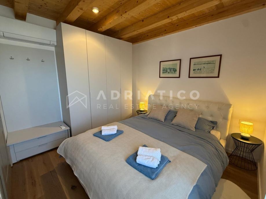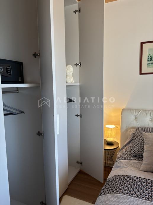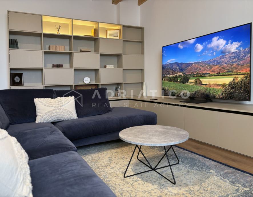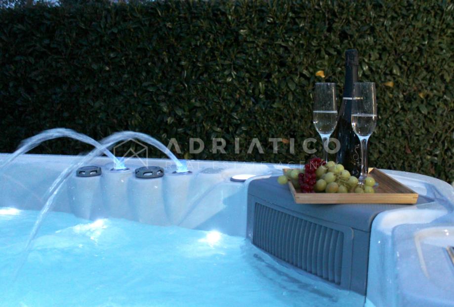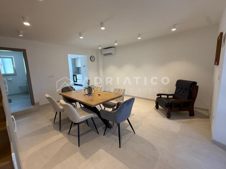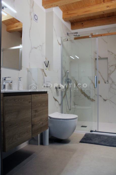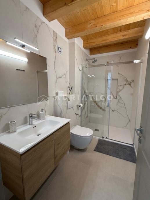 U prizemlju kuće nalazi se funkcionalna kuhinja, blagovaonica i kupaonica, s direktnim izlazom na prostranu natkrivenu terasu. U cijelom prizemlju ugrađeno je električno podno grijanje koje osigurava ugodnu i ravnomjernu toplinu tijekom cijele godine. Terasa je opremljena pomičnom pergolom i ljetnom kuhinjom, a dodatni komfor pružaju vanjski tuš i hidromasažna kada za pet osoba, idealna za opuštanje i druženje. Na prvom katu smješteni su dnevni boravak i jedna spavaća soba, dok drugi kat obuhvaća dodatnu spavaću sobu i kupaonicu. Na trećem katu nalazi se glavna spavaća soba s vlastitom kupaonicom i lijepim pogledom na more, što ovom prostoru daje dodatnu vrijednost i privatnost.