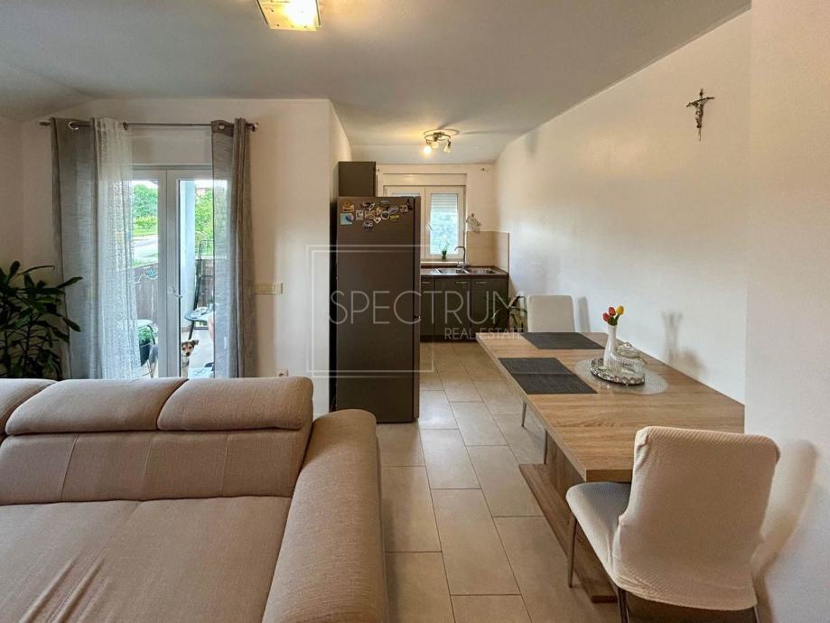 Stan se nalazi na 1.katu stambene zgrade. Površina stana iznosi 64.80 m2. Stan se sastoji od ulaznog hodnika, prostranog dnevnog boravka sa kuhinjom i blagovaonicom open space koncepta, 2 spavaće sobe, kupaonice i natkrivenog balkona koji je idealan za uživanje. Na balkon se dolazi iz dnevnog boravka. Raspored prostorija je takav da stan zaista pruža komfor. Grijanje u stanu regulirano je putem peći na drva i klima uređaja. Stan se prodaje namješten.