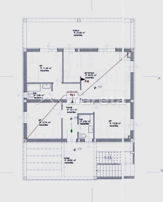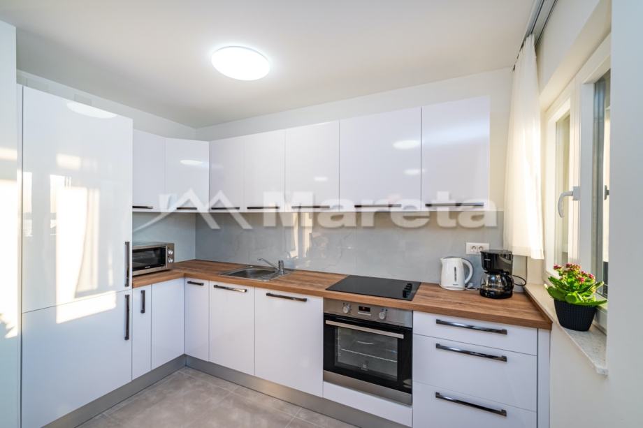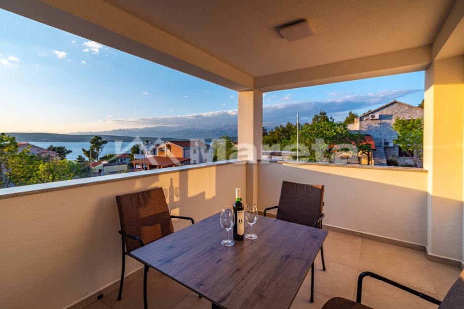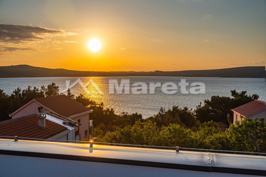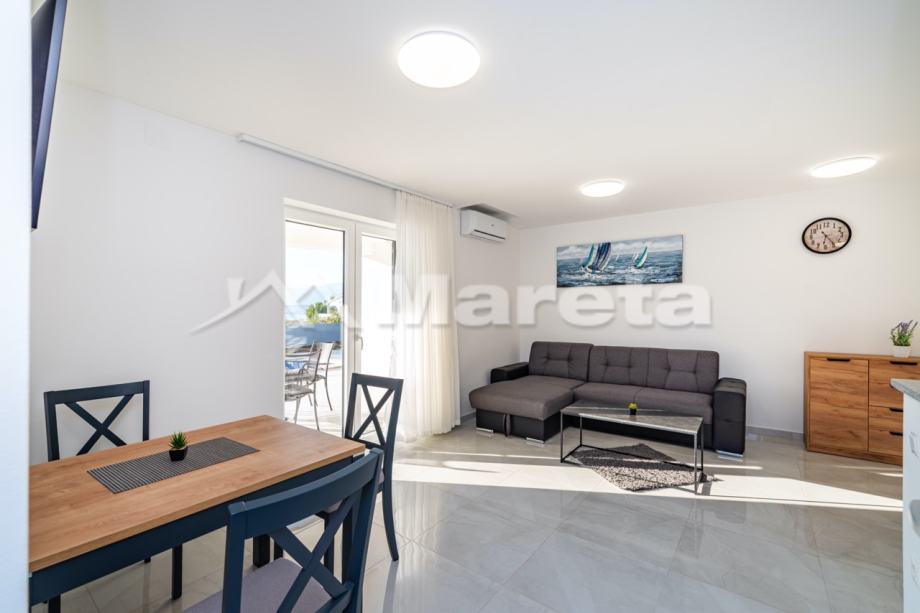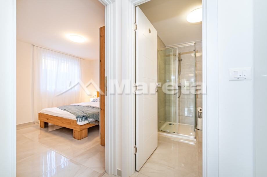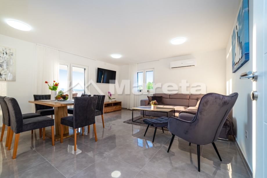 Na kat se dolazi vanjskim stepeništem i tamo je veliki apartman cca 100 m2 stambene površine koji se sastoji od tri spavaće sobe, dvije kupaonice s wc-om, veliki dnevni boravak s kuhinjom, jednom natkrivenom terasom od 30 m2 s pogledom na more i jedna nenatkrivena terasa od 35 m2.