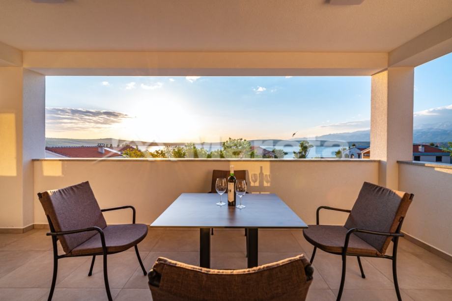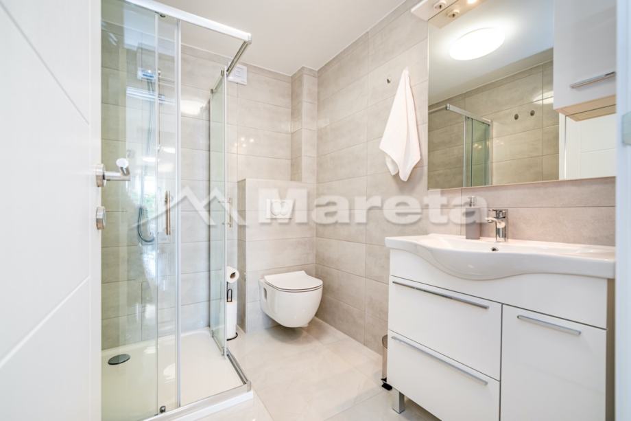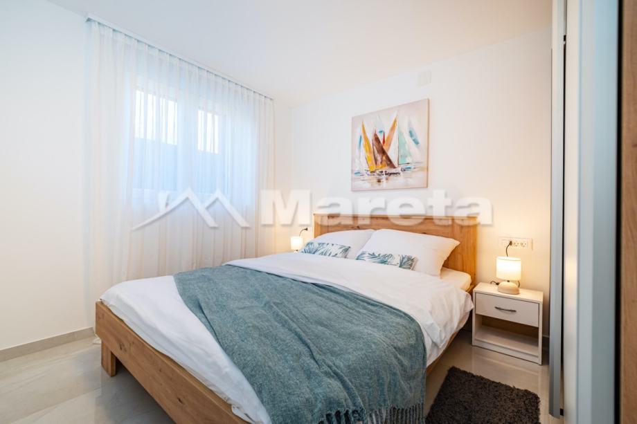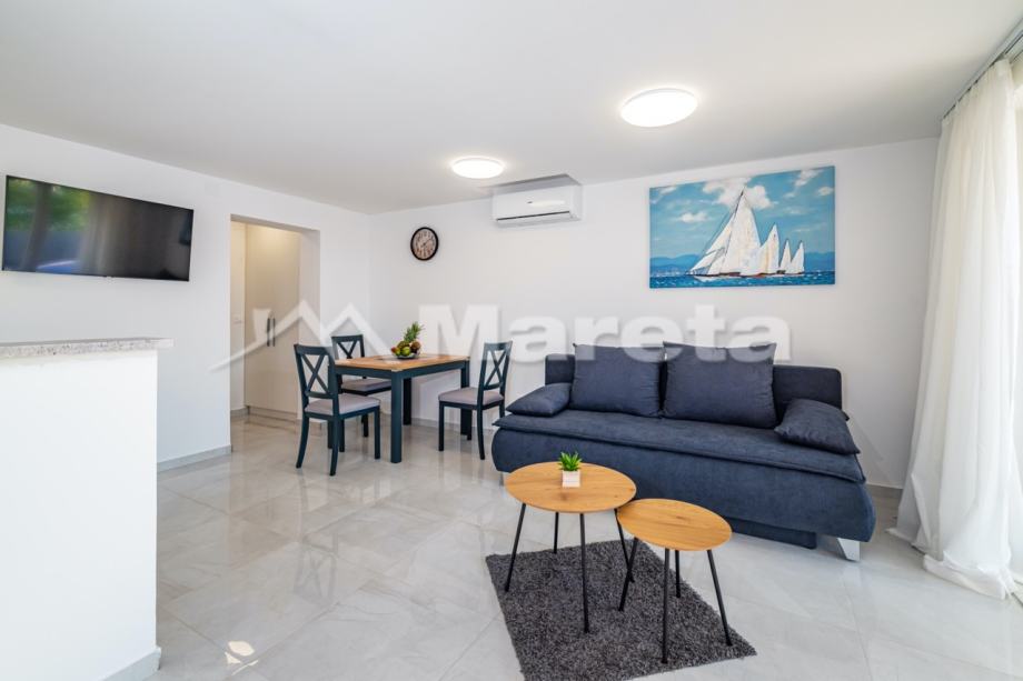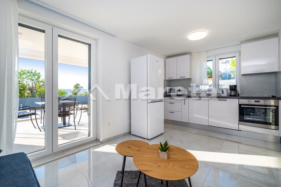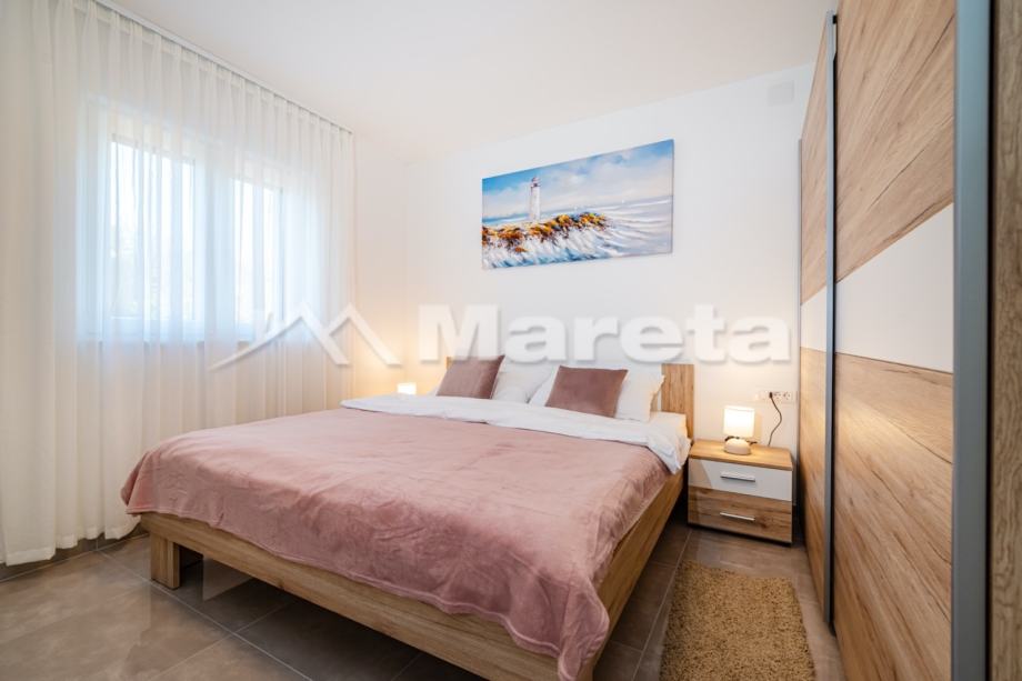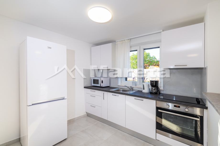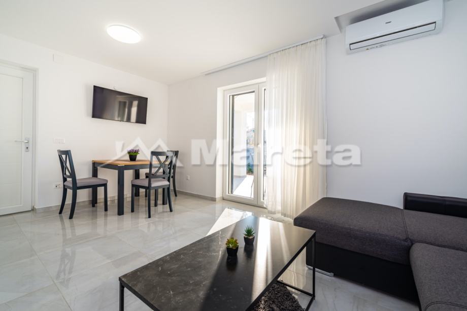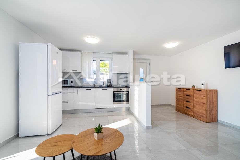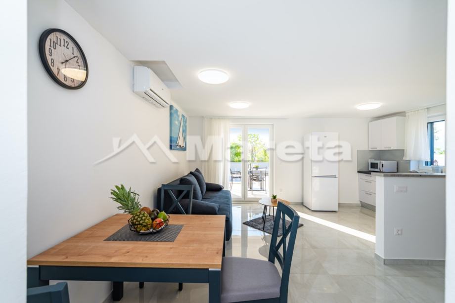 Svaki od njih su otprilike oko 45 m2 površine i imaju pripadajuću natkrivenu terasu od 15 m2 s koja je okrenuta i ima pogled na more. U prizemlju se također nalazi i prostorija u kojoj je kotlovnica sa spremištem, ljetna kuhinja s wc-om i vanjski roštilj s pripadajućom terasom od cca 10 m2.