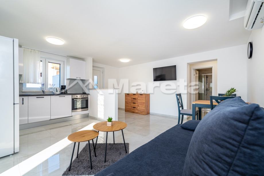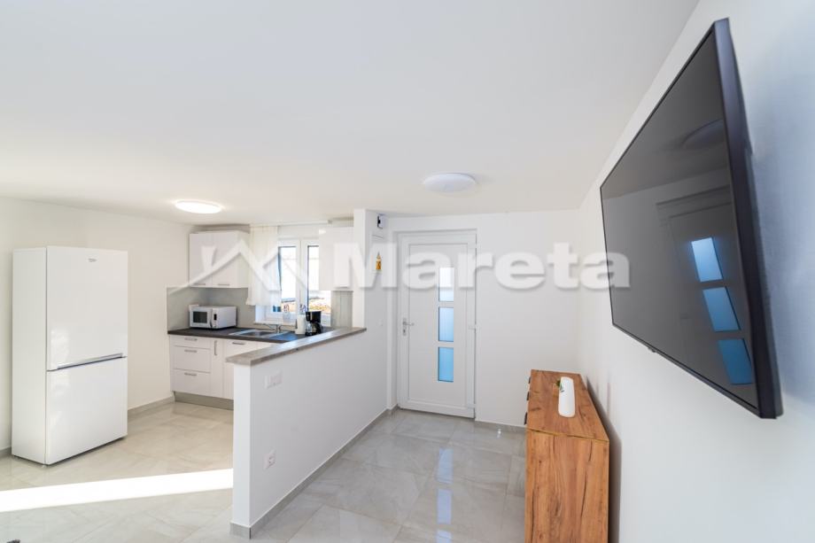 U prizemlju su smještena dva jednosobna uređena i namještena apartmana koji se sastoje od
