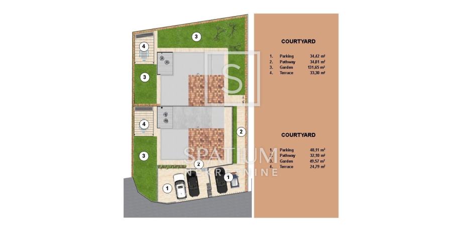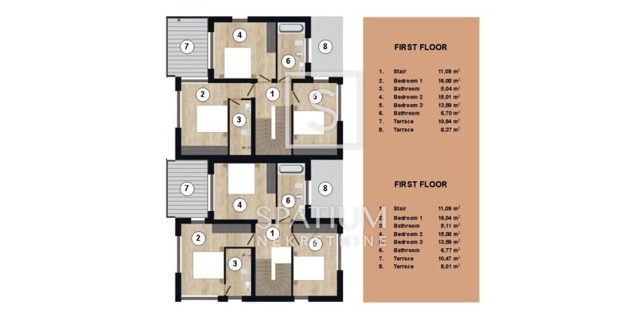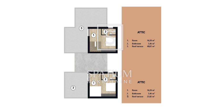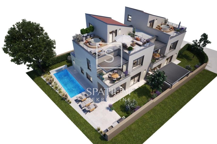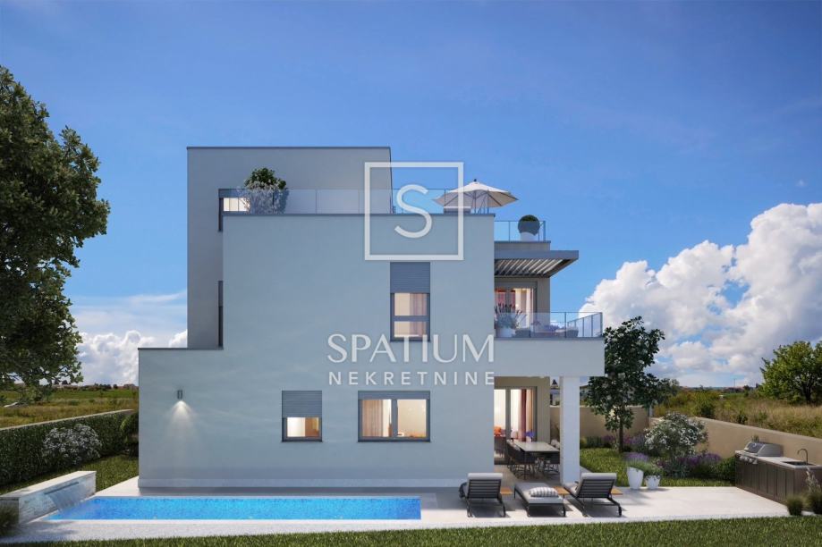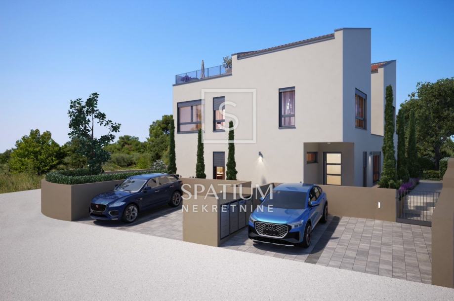 Kuća se sastoji od prizemlja, kata i visokog potkrovlja s krovnom terasom. Prizemlje se sastoji od "open space" kuhinje s blagovaonicom i dnevnim boravkom, dvije spavaće sobe i toaleta za goste. Na katu kuće se nalaze još tri spavaće sobe, svaka s pogledom na more i dvije kupaonice. U visokom potkrovlju je krovna terasa s jacuzzijem i panoramskim pogledom na more. Na okućnici od 300 m2 kuće nalaze se bazen i dva parkirna mjesta. Grijanje će biti etažno podno putem dizalice topline dok će za hlađenje biti postavljene "Inverter" klima uređaji.